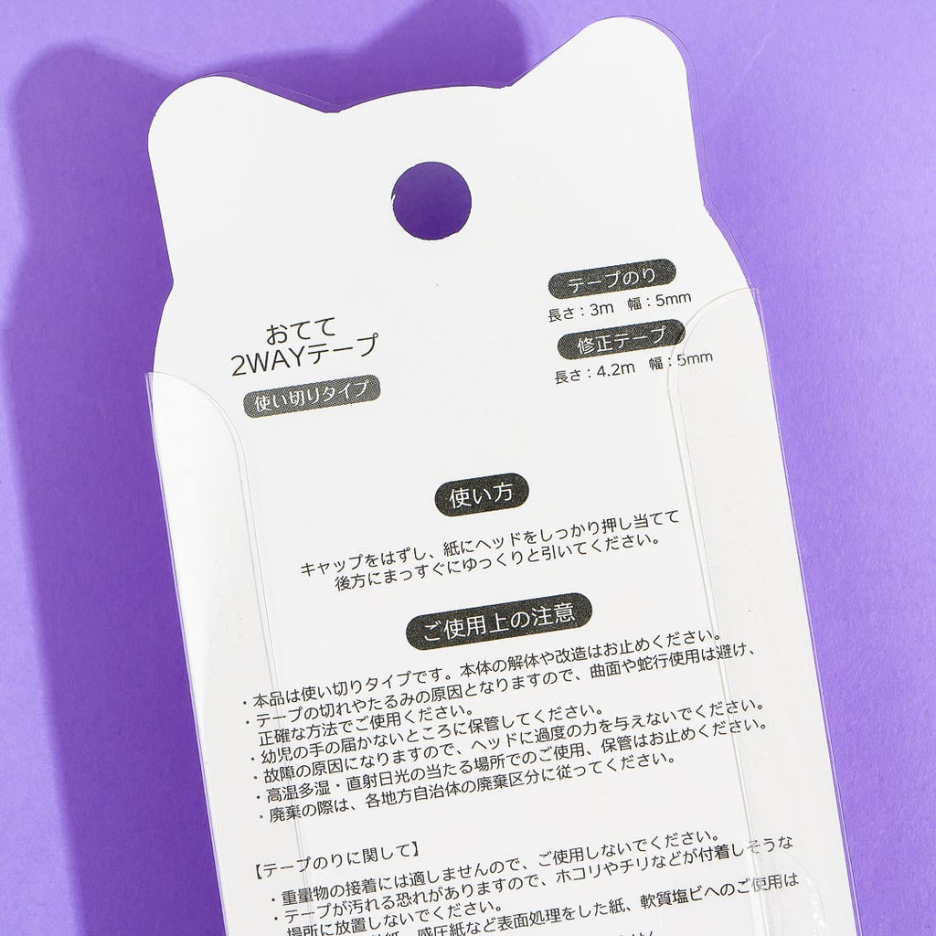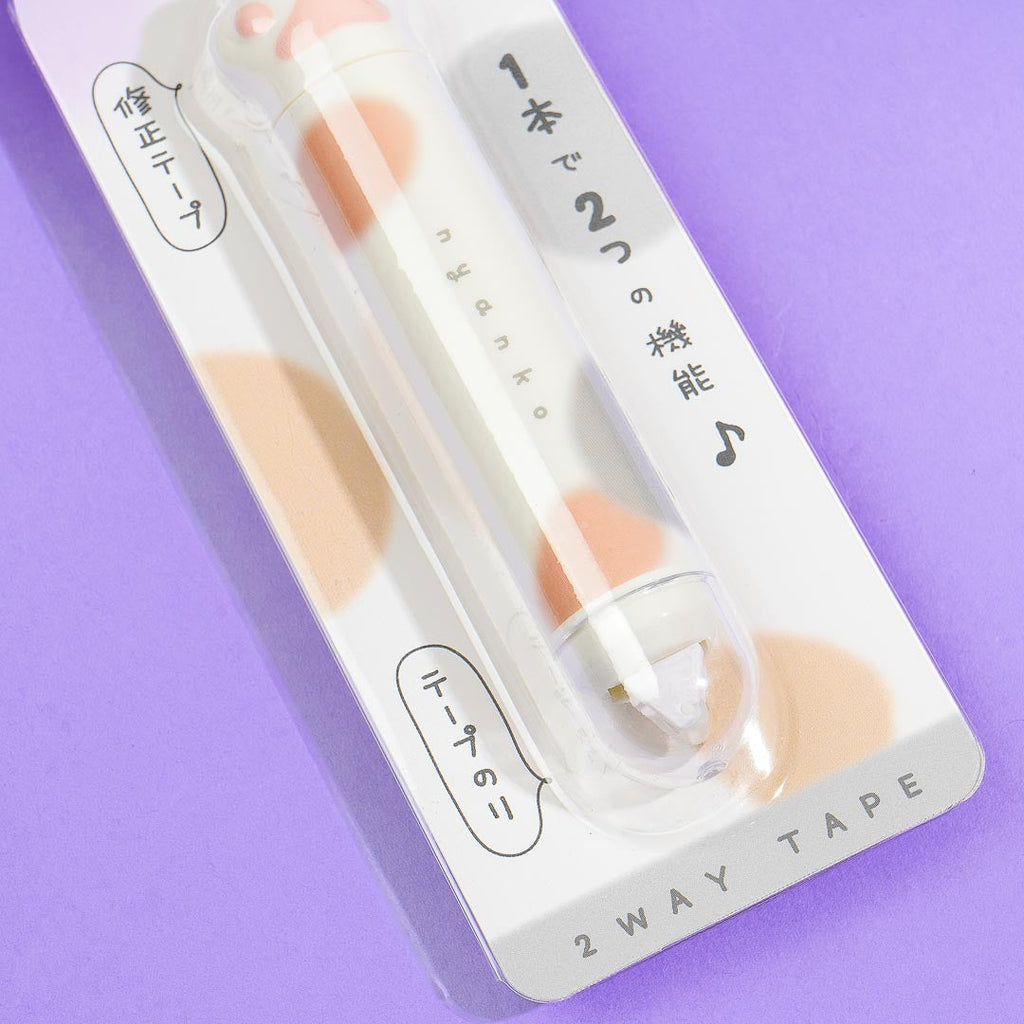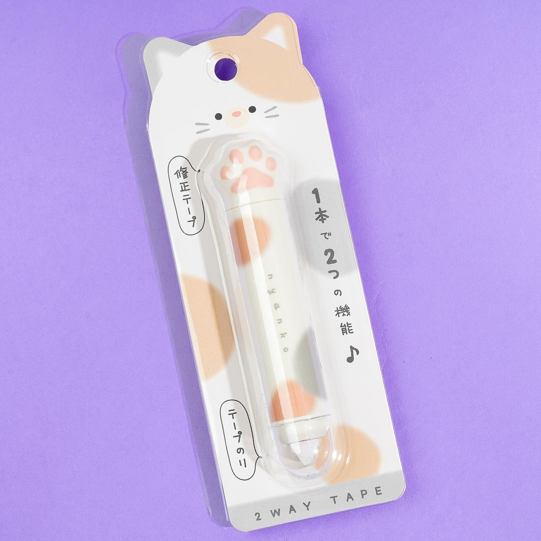 Bring this kawaii two-way correction tape to school! It comes in a convenient pen-shaped case so it's easy to put in your pencil case. The end part features a glue stick that a cap shaped like a cat paw!
