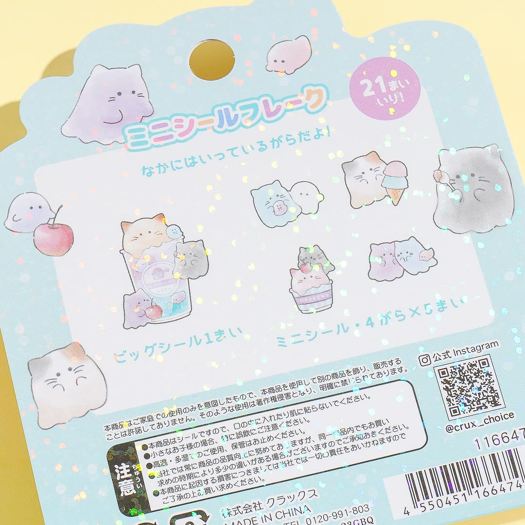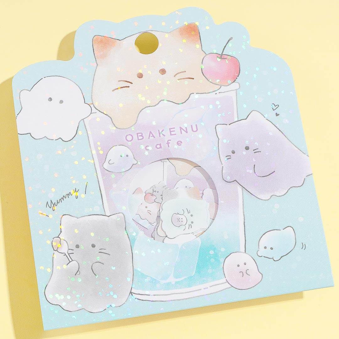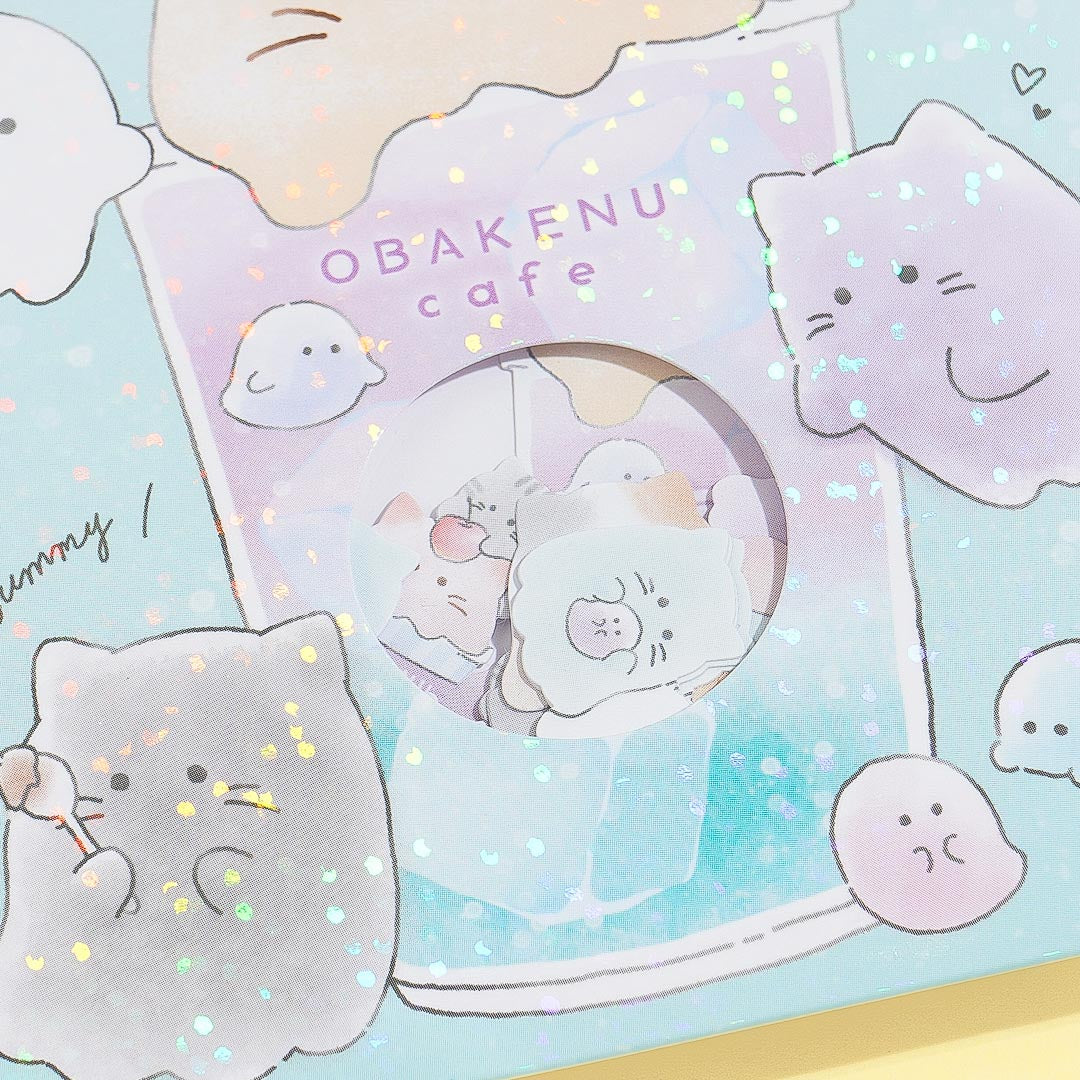 Use this glittery pack of kawaii sticker flakes to decorate your scrapbook! It features the Obakenu ghosts playing around with cafe goodies. This sticker pack is the perfect addition to your kawaii stationery collection.