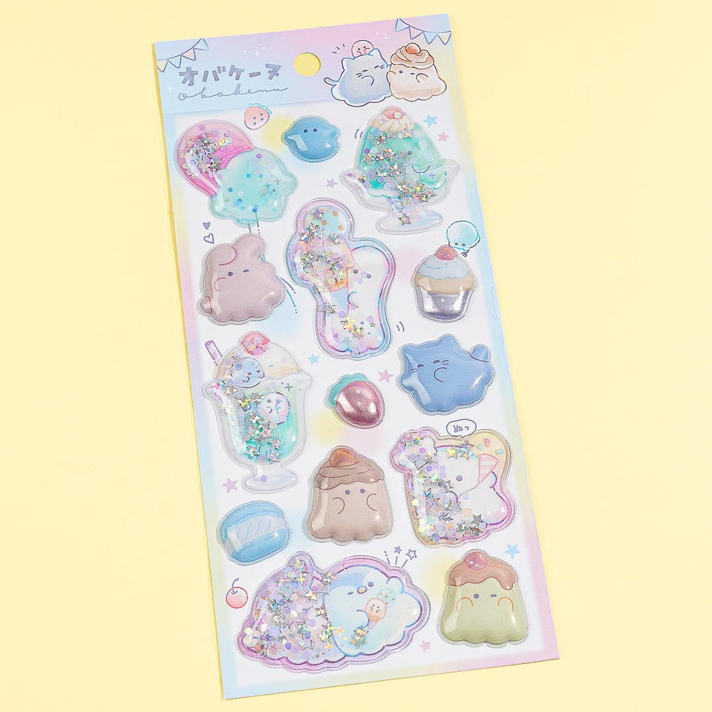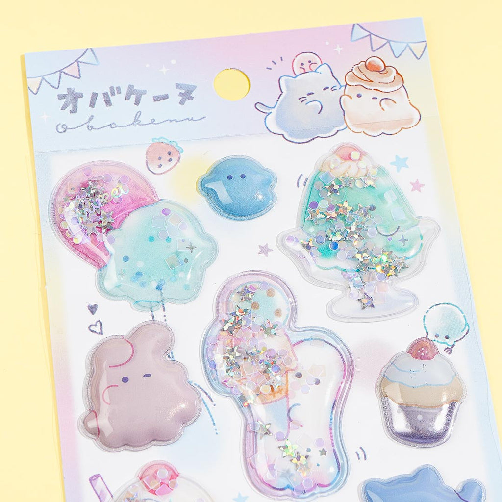Jazz up your plain notebook cover by decorating it with these kawaii die-cut stickers! The set features prints of Obakenu ghosts partying while having desserts! Each puffy piece has moving glitters inside.