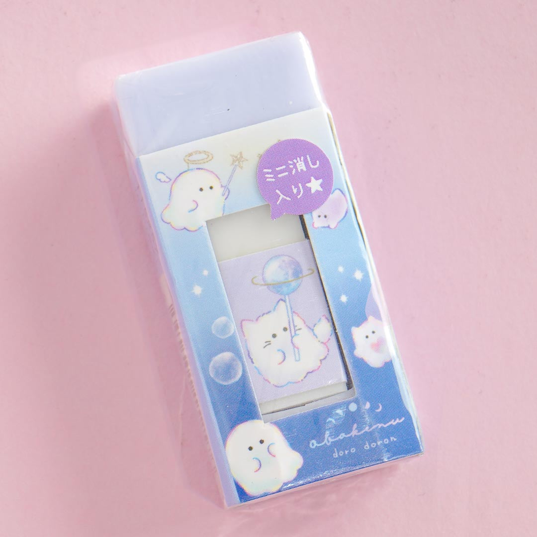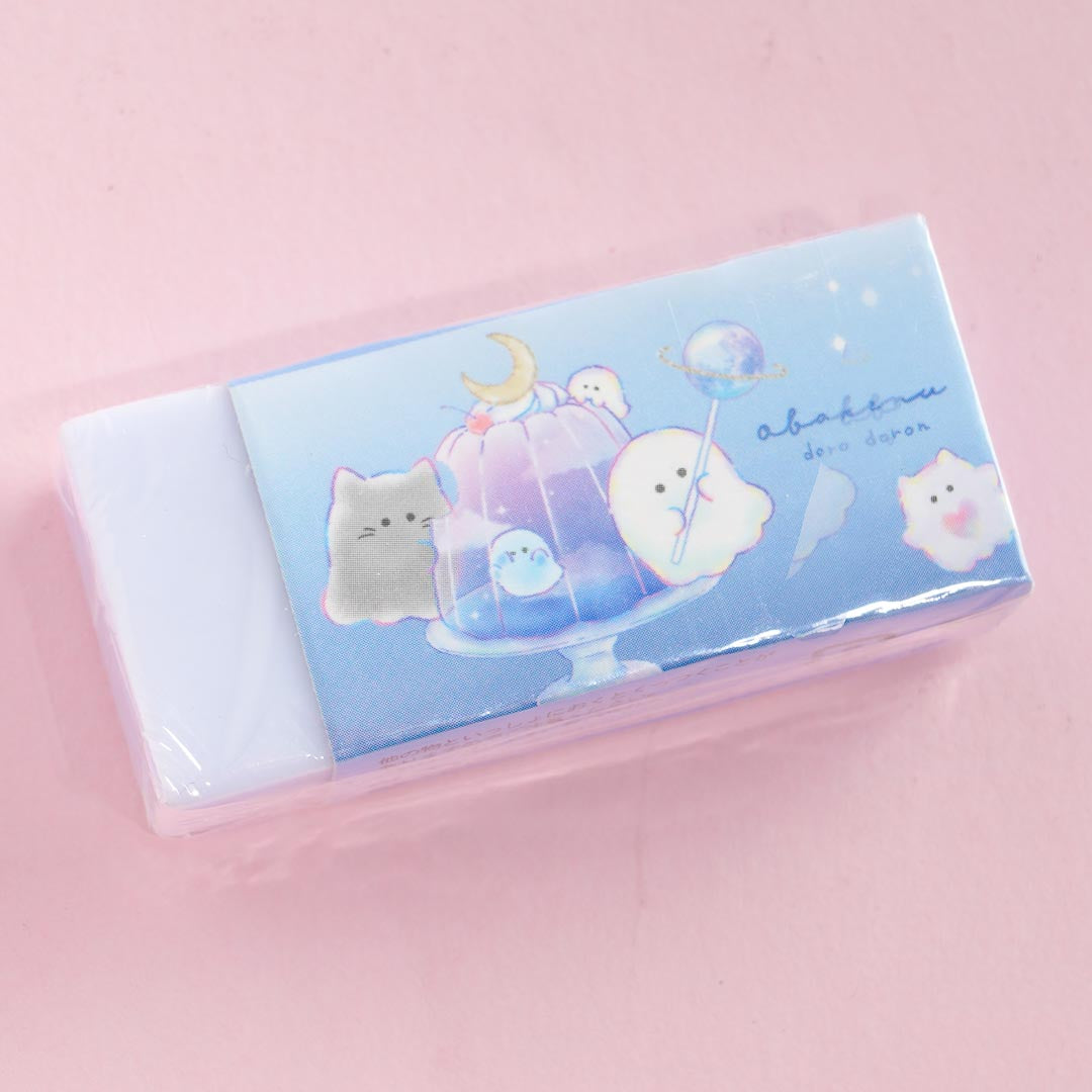 Correct your mistakes when you doodle with this kawaii square eraser! It features cute illustrations of parent and child Obakenu cat ghosts with a huge platter of jelly.