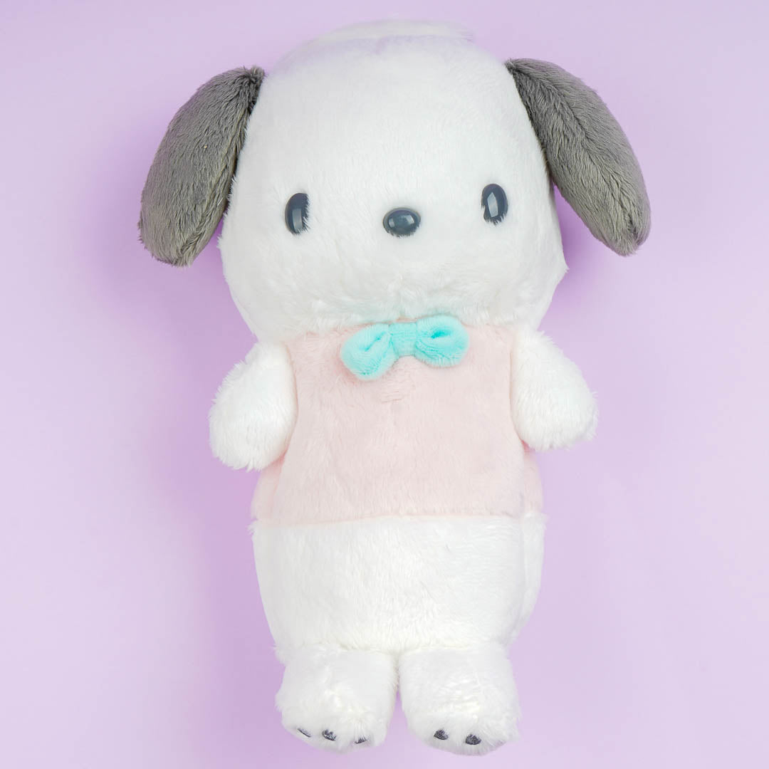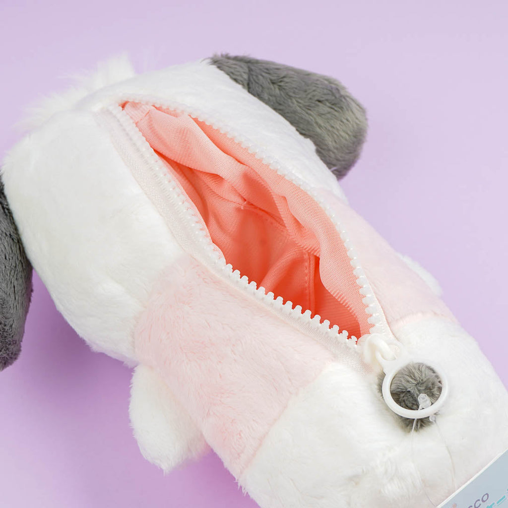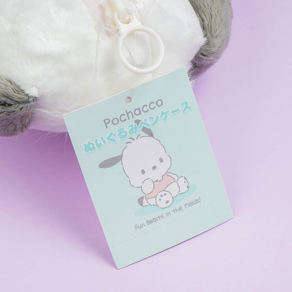 Use this super cute and fluffy pen case to store your writing tools! It looks like a kawaii standing Pochacco plushie - complete with a bow tie and a spacious compartment.