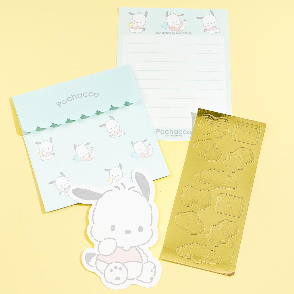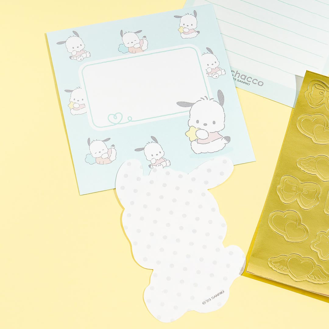 Includes: 10 x Pochacco die-cut sheets, 10 x square sheets, 10 x mini envelopes, and 1 x gold sticker sheet