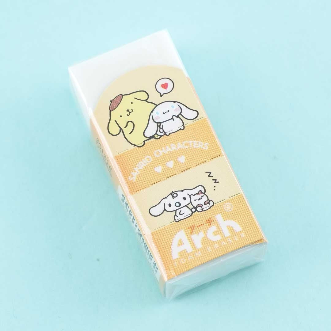 A kawaii plastic foam eraser that has an arched cardboard case featuring Pompompurin and Cinnamorolli