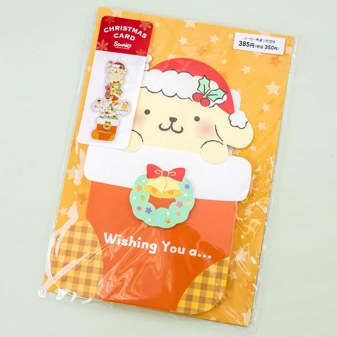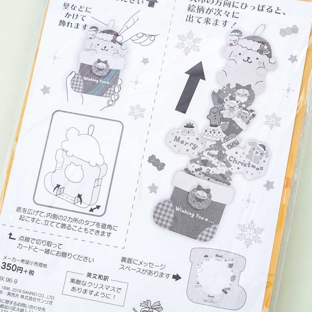 This die-cut greeting card features a cute print of Pompompurin wearing a Santa hat while inside a giant Christmas stocking and comes with an envelope! Use this to greet your classmates or work colleagues with a great holiday! Let them be delighted when they pull the card’s string to reveal an expandable Christmas tree full of snow, gifts, and sweets!