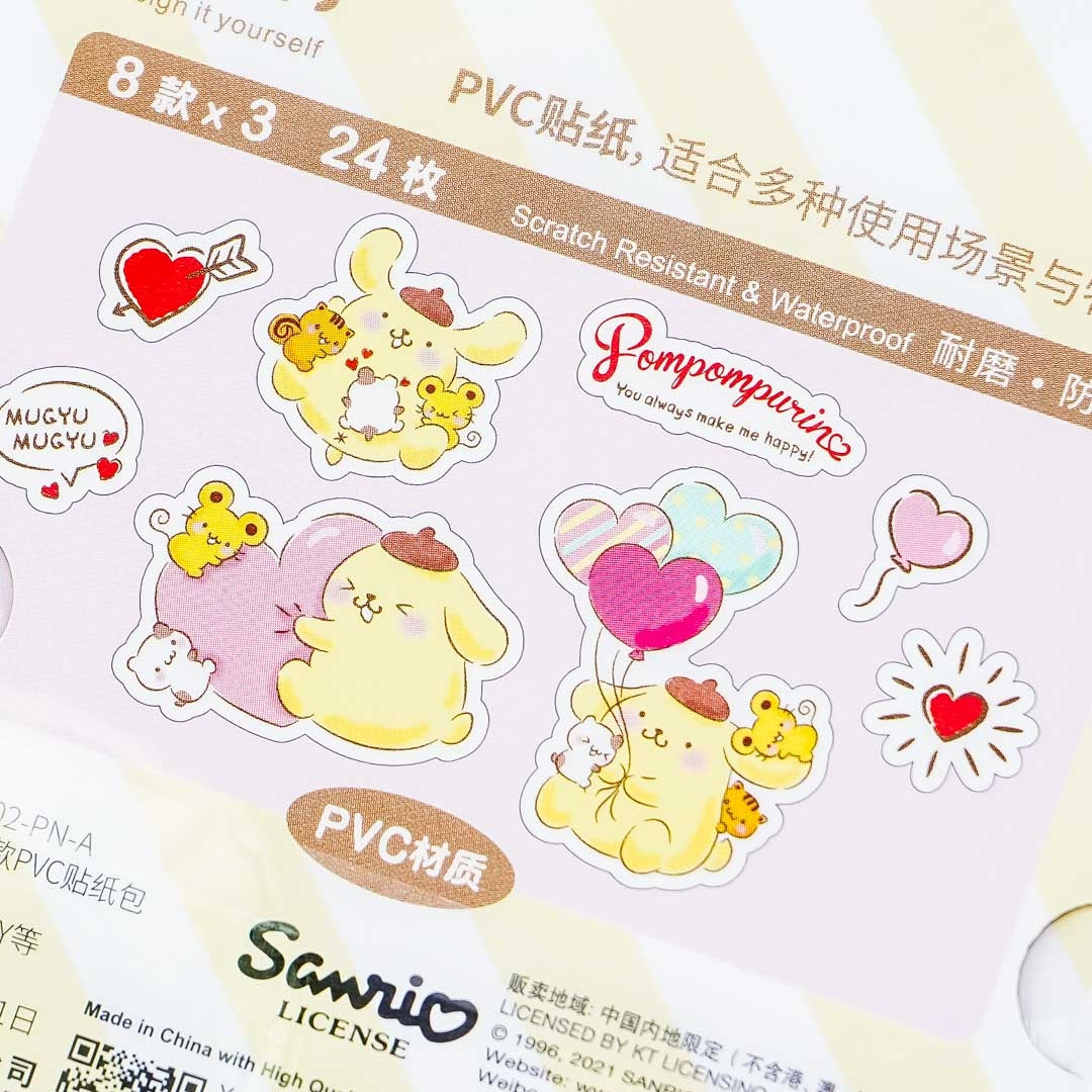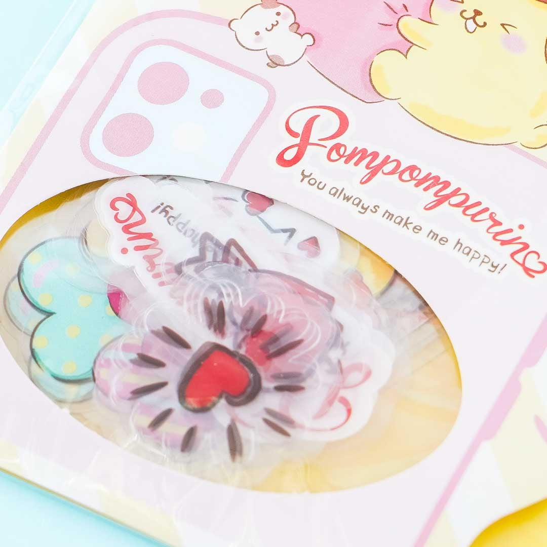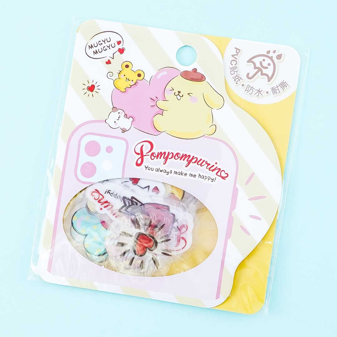 A kawaii pack of semi-transparent sticker flakes featuring Pompompurin with hearts and friends