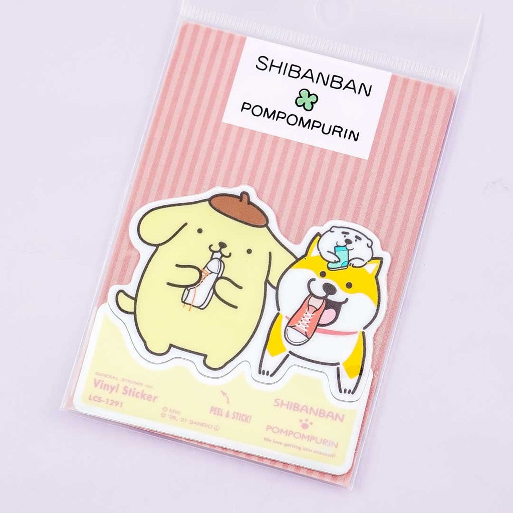 A kawaii die-cut vinyl sticker illustrated with Pompompurin and Shibanban playing with sneakers