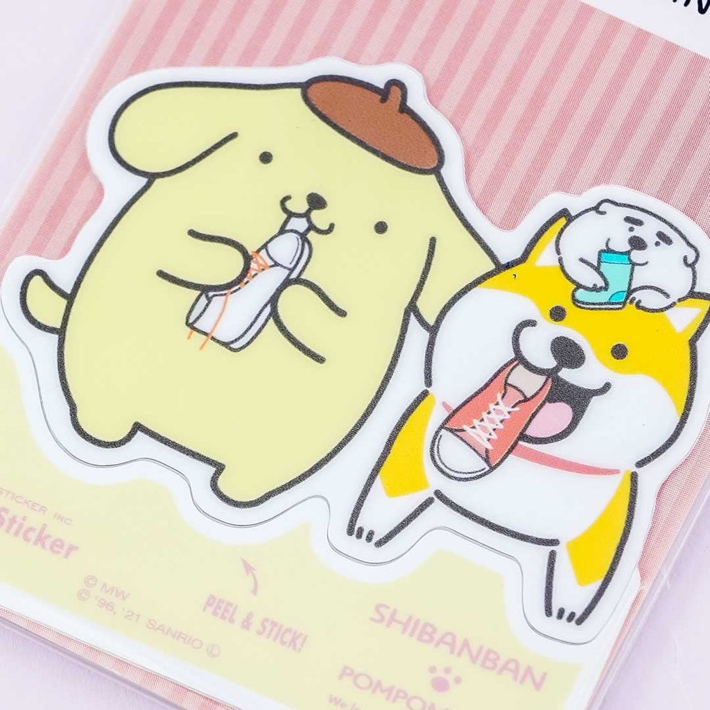 Decorate your diary with this super cute sticker. This die-cut vinyl sticker features prints of Pompompurin and Shibanban playing with sneakers! It's waterproof and easy to peel off!
