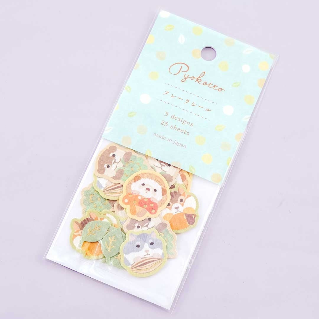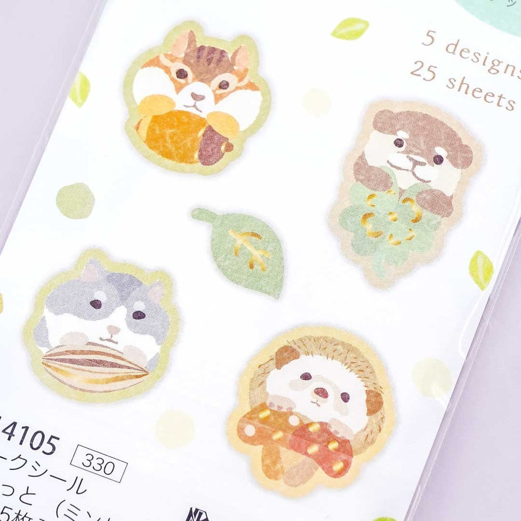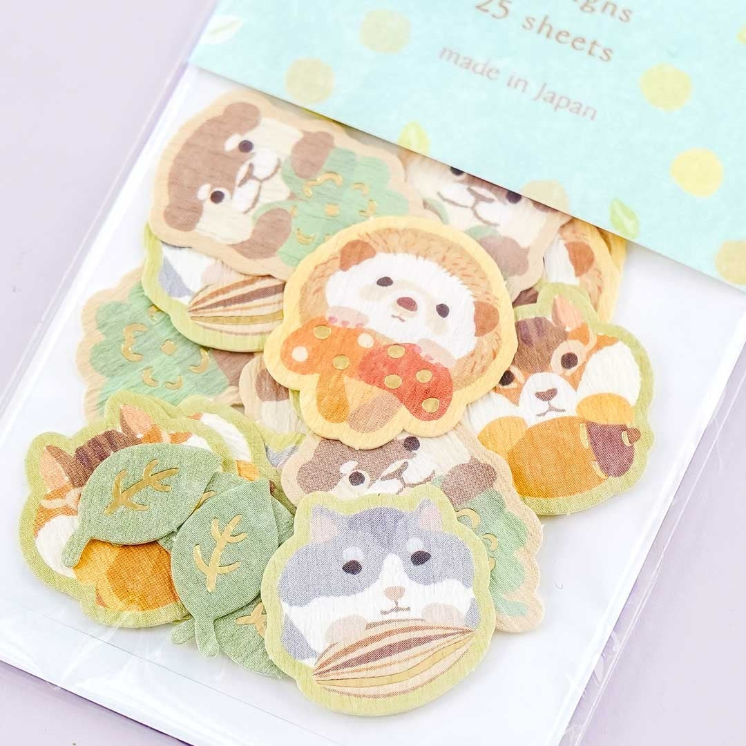 Make your notebooks look cuter with these kawaii die-cut deco stickers! This set has five different designs featuring prints of leaves and cute animals who like to burrow or dig like squirrels, hamsters, hedgehogs, and otters. Each piece is made of crepe paper and has gold detailing.