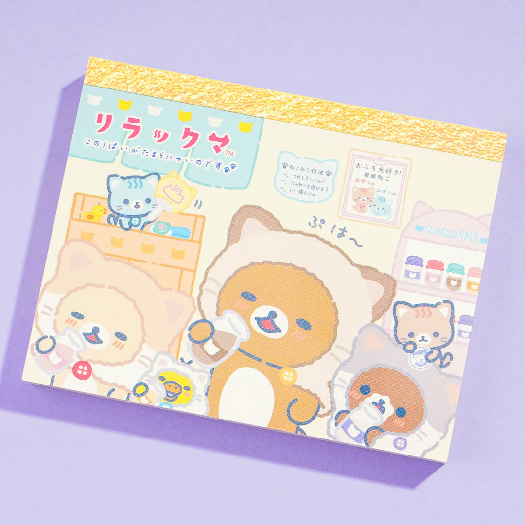Write your reminders kawaii-style on this mini notepad! It features cute prints of Rilakkuma and friends in a cat-themed public bathhouse.
