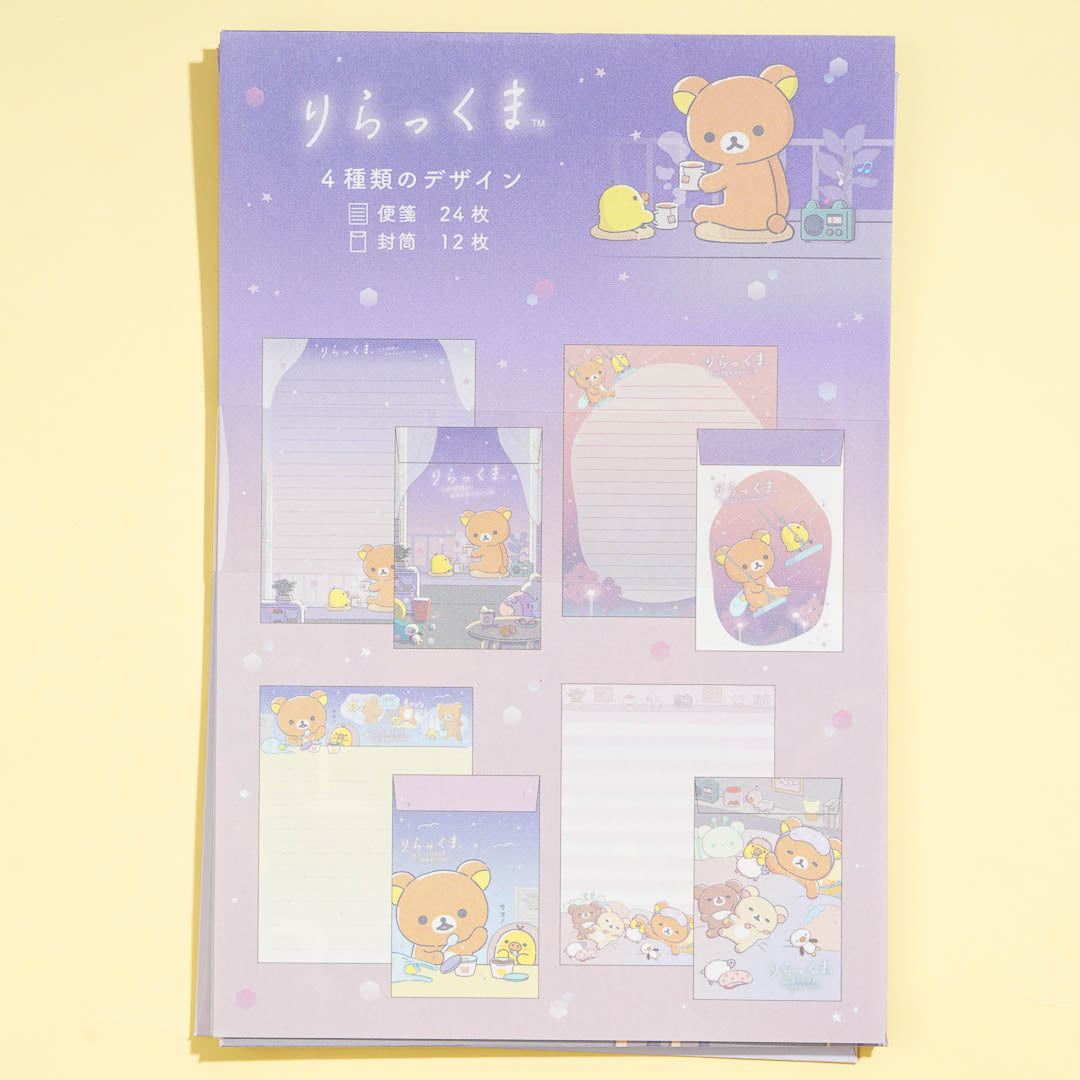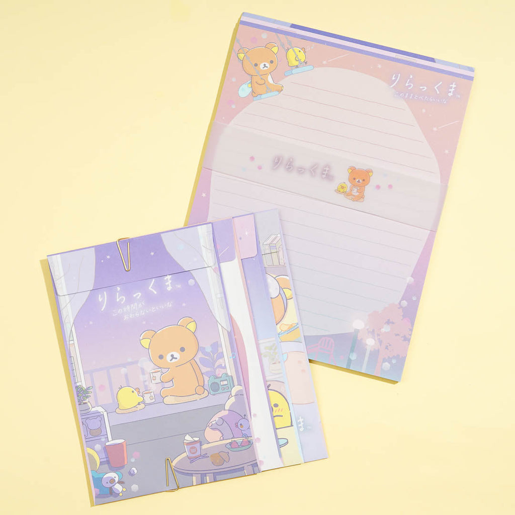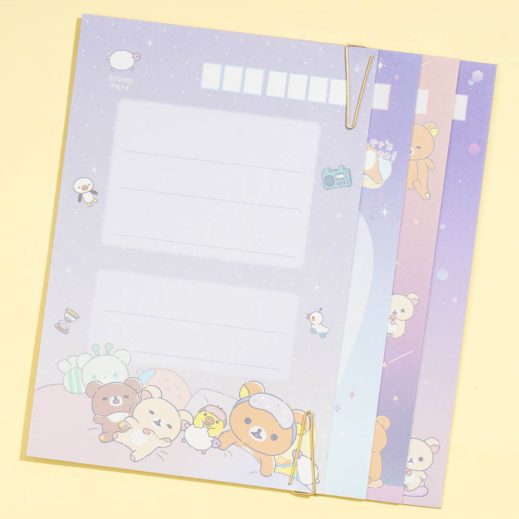 Write messages to your friends using this kawaii letter see with four different designst! It showcases cute prints of Rilakkuma and friends having a sleepover.