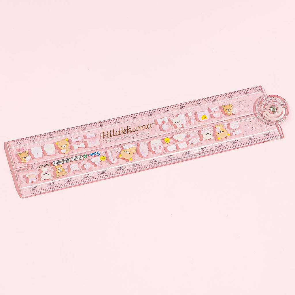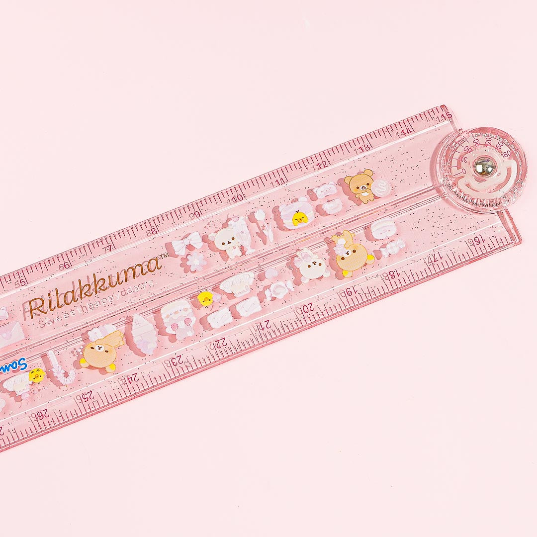 Draw shapes for your art and math project kawaii-style using this ruler! Its clear glittery design features Rilakkuma and sweets. This is a folding ruler so you can easily place this in your pen case, and it even doubles as a protractor!