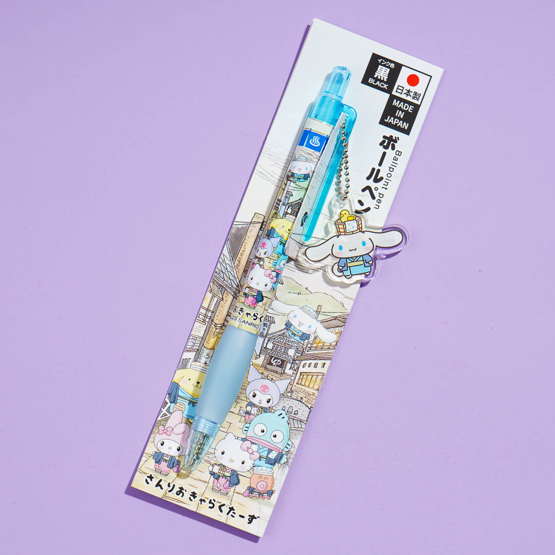 Write your journal entries with the help of this kawaii ball point pen from the Sanrio Showa Hot Spring series. It features prints of Sanrio Characters all dressed up in hot spring outfits from the Showa era in Japan.  This pen comes with a cute Cinnamoroll charm with a removable ball chain
