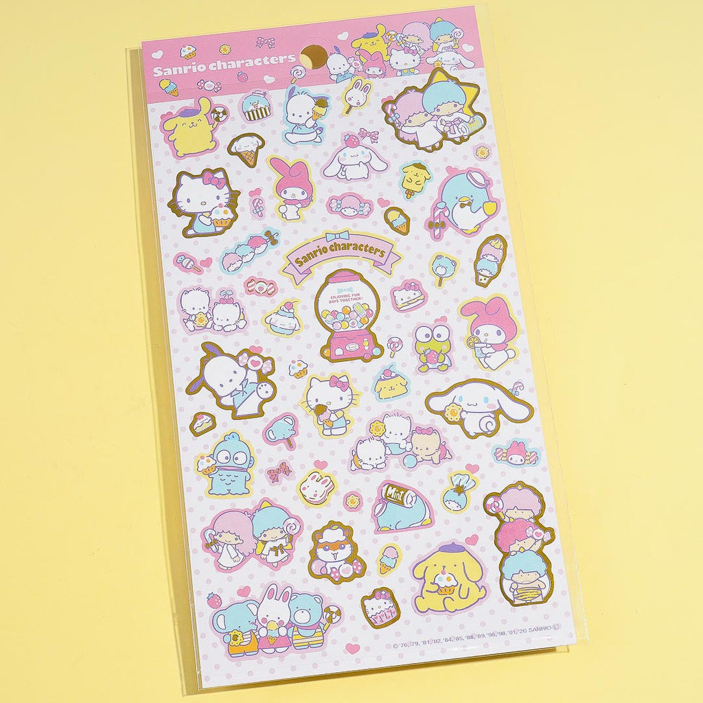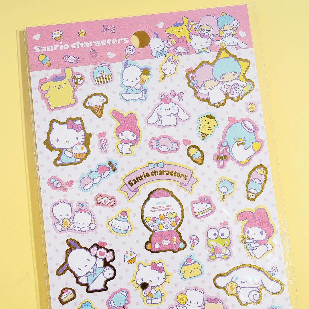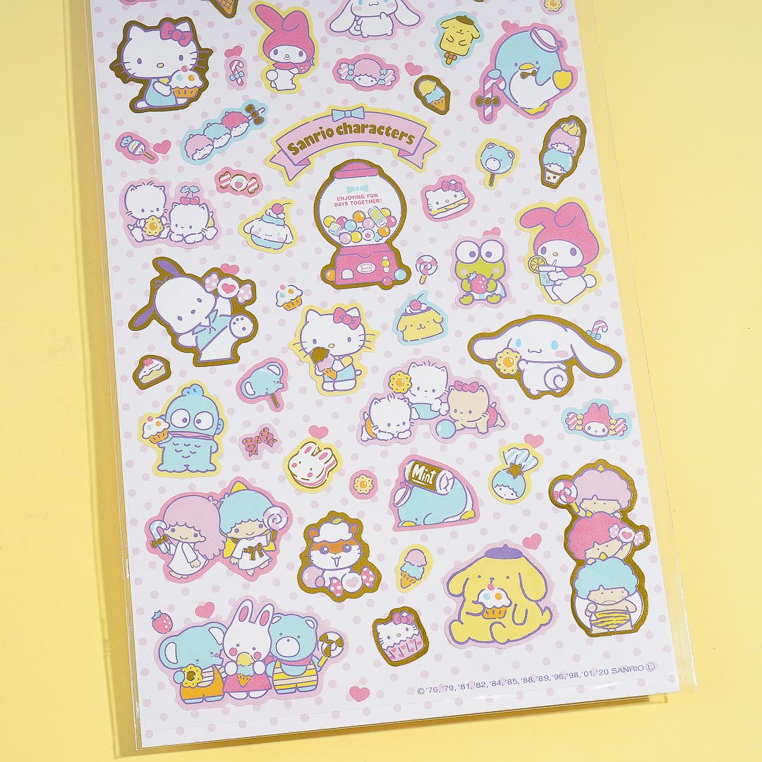 Embellish the pages of your daily planner with this cute sheet of stickers. It showcases cuties from Sanrio playing with yummy sweets! These stickers have golden details.