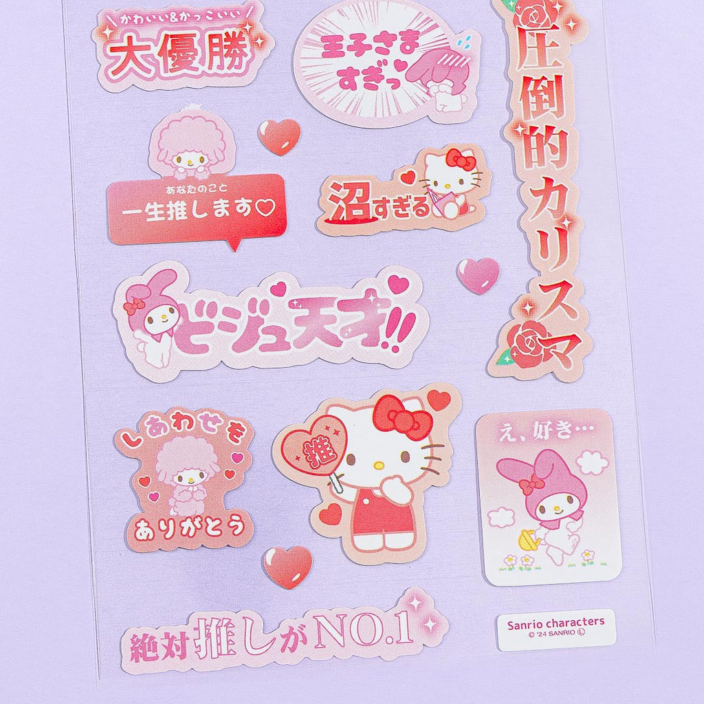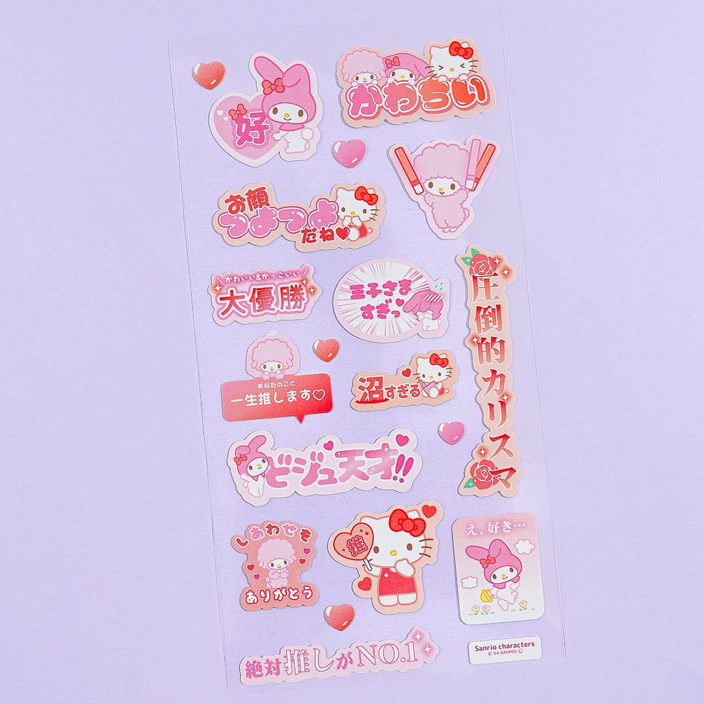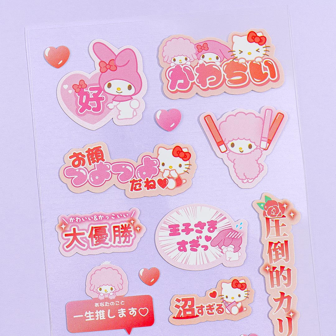 Use this super kawaii sheet of stickers to decorate your journal. It features prints of Sanrio's sweet girls My Melody, My Sweet Piano, and Hello Kitty with encouraging messages written in Japanese. This sticker sheet comes from the Sanrio Sukip series!