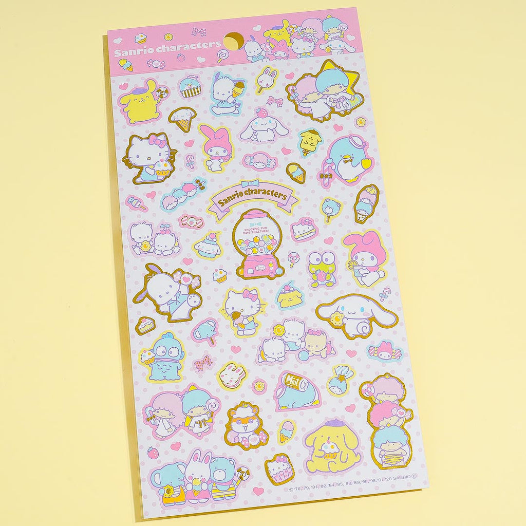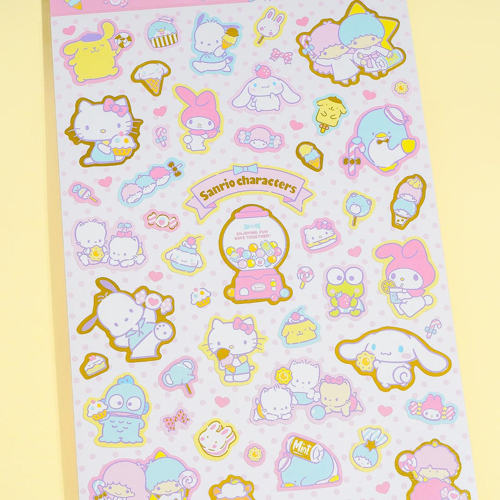 Have fun decorating your notebook covers with this cute sheet of stickers. It showcases cuties from Sanrio eating cupcakes, candy, and other sweet treats! Each sticker has nice gold details.