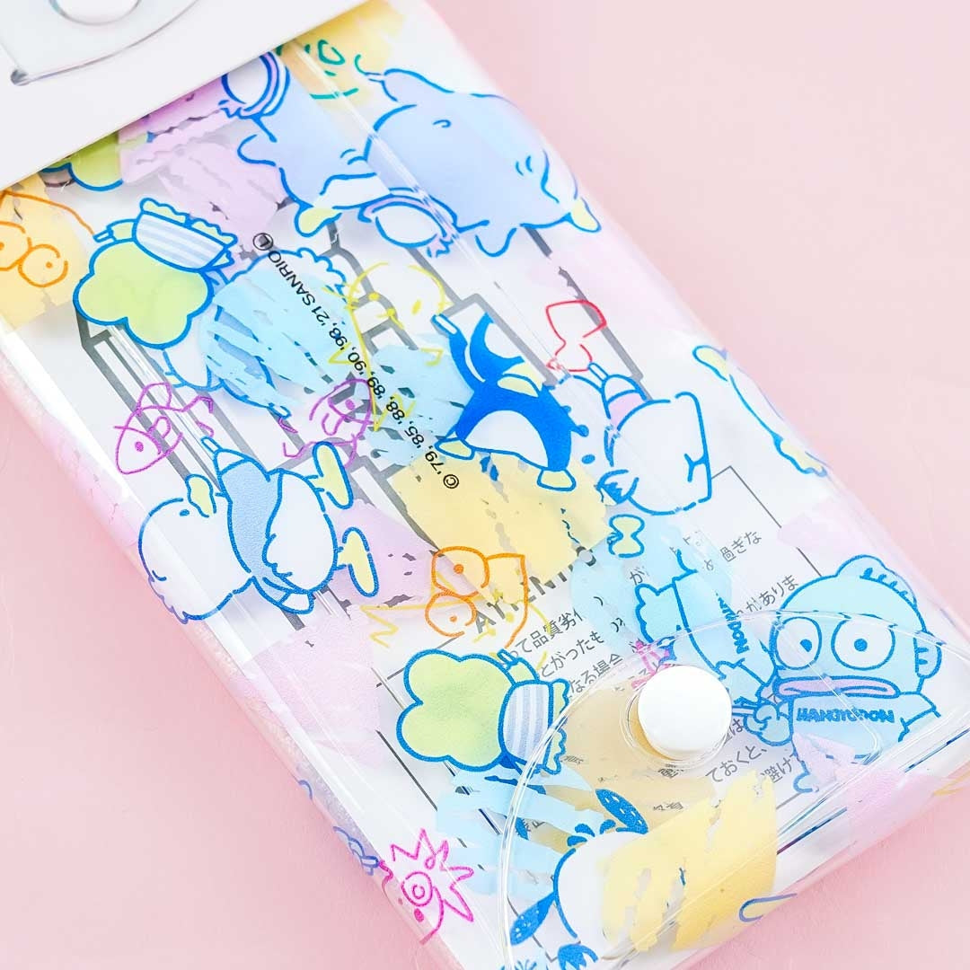 Organize your favorite pens inside this transparent case with prints of the Hapidanbui gang making doodles together! This group of friends consists of Sanrio characters Hangyodon, Pekkle, Kero Kero Keroppi, Pochacco, Bad Badtz-Maru, and Tuxedosam! The case is made of durable plastic and has button closures on opposite sides.