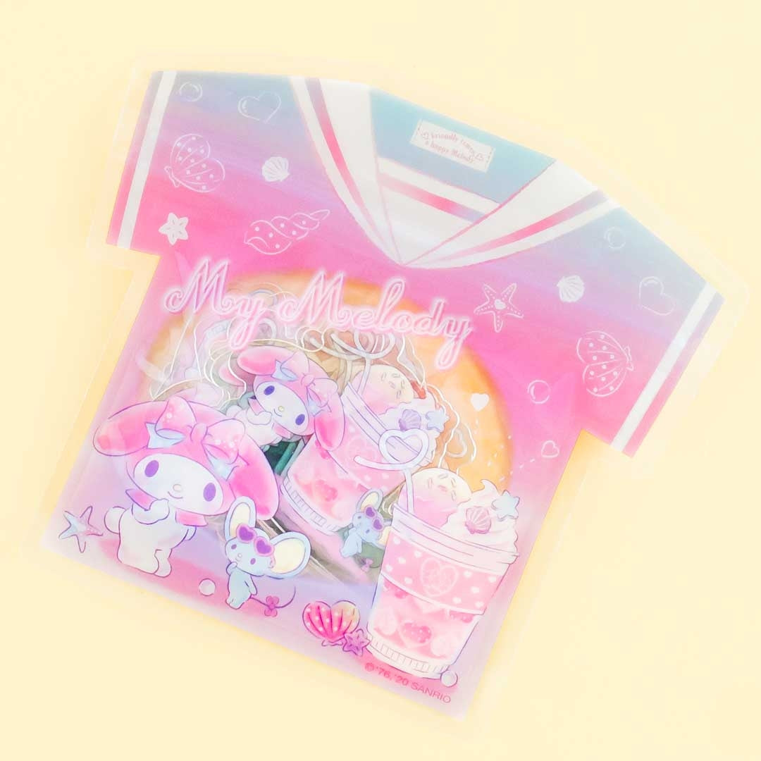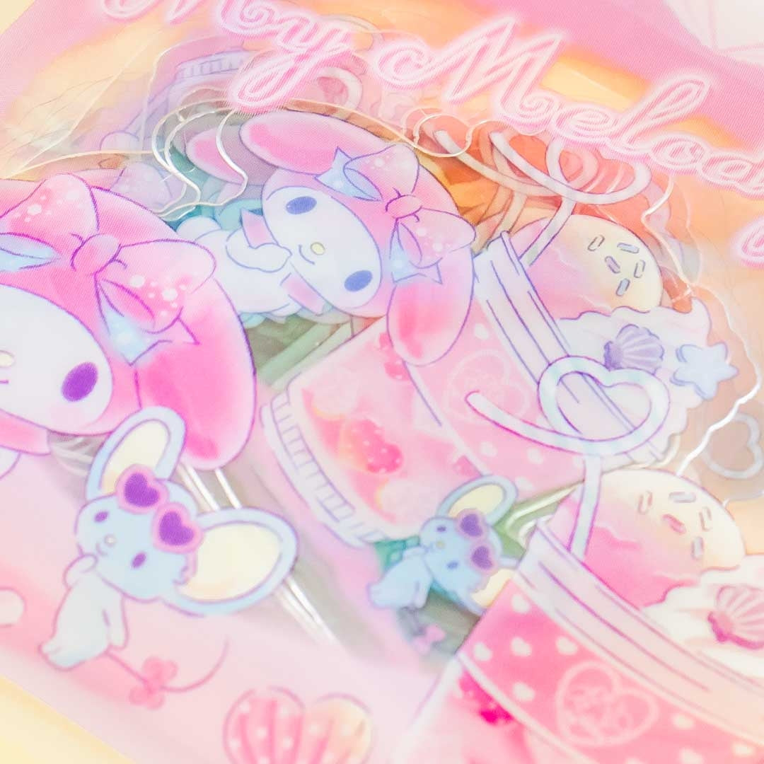 Decorate your vanity mirror with these super cute die-cut stickers featuring My Melody and her friend Chip drinking milkshakes! These deco flakes come in ten different designs and come in a tee-shaped resealable pack. Each kawaii sticker is made of transparent material with silver edging!