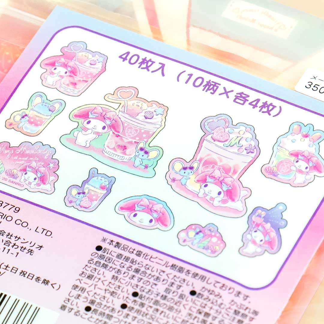 A pack of die-cut deco stickers featuring My Melody, Chip, and milkshakes
