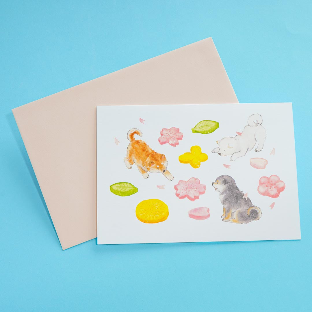 This kawaii greeting card features a cute illustration of 3 Shiba Inus playing with giant biscuits. It has a sakura theme and is perfect for writing thoughtful letters to your friends!