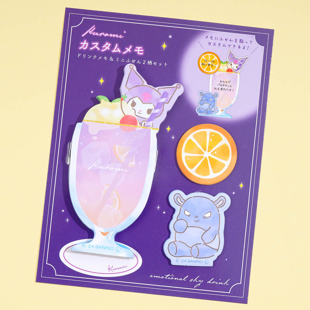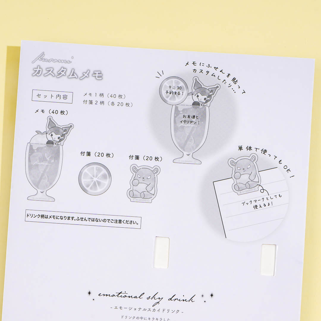 Use this super cute die-cute memo pad and sticky note set to write down important reminders. It showcases Kuromi and her bestie Baku playing with a magical ice cream soda! Add this memo pad and sticky note set to your stationery collection.