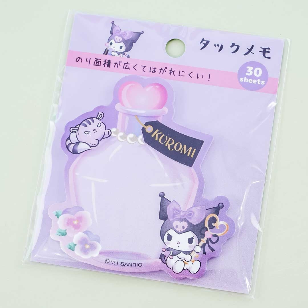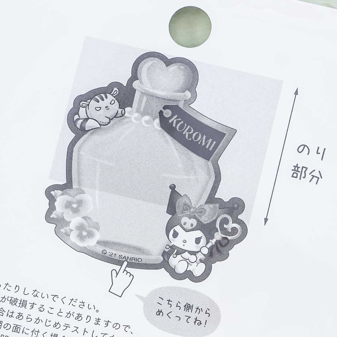 Leave short sweet notes on your whiteboard using these super cute sticky notes! This kawaii die-cut sheet features a print of Kuromi beside a huge perfume glass bottle.