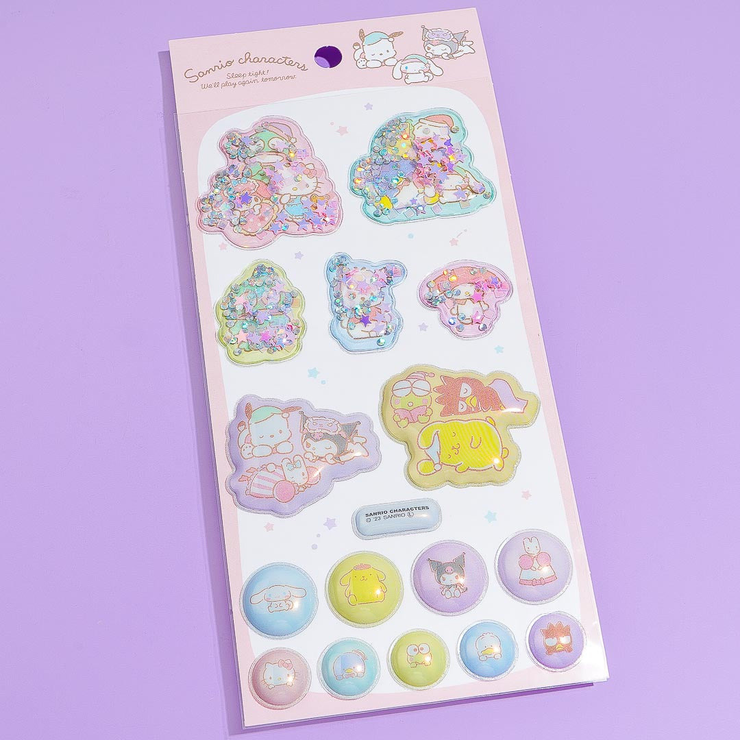 Decorate your scrapbook with this sheet of cute shaker stickers. They showcase cuties from Sanrio hanging out with each other! Some of these liquid-filled stickers have glitter inside them. Shake them around and enjoy listening to that nice crunchy sound!
