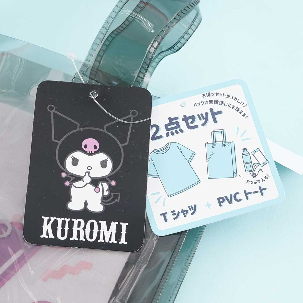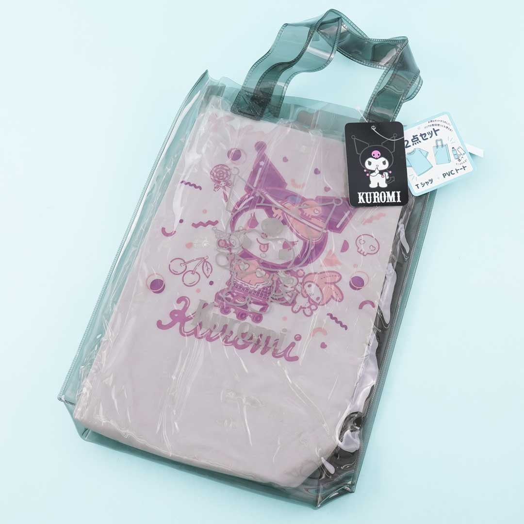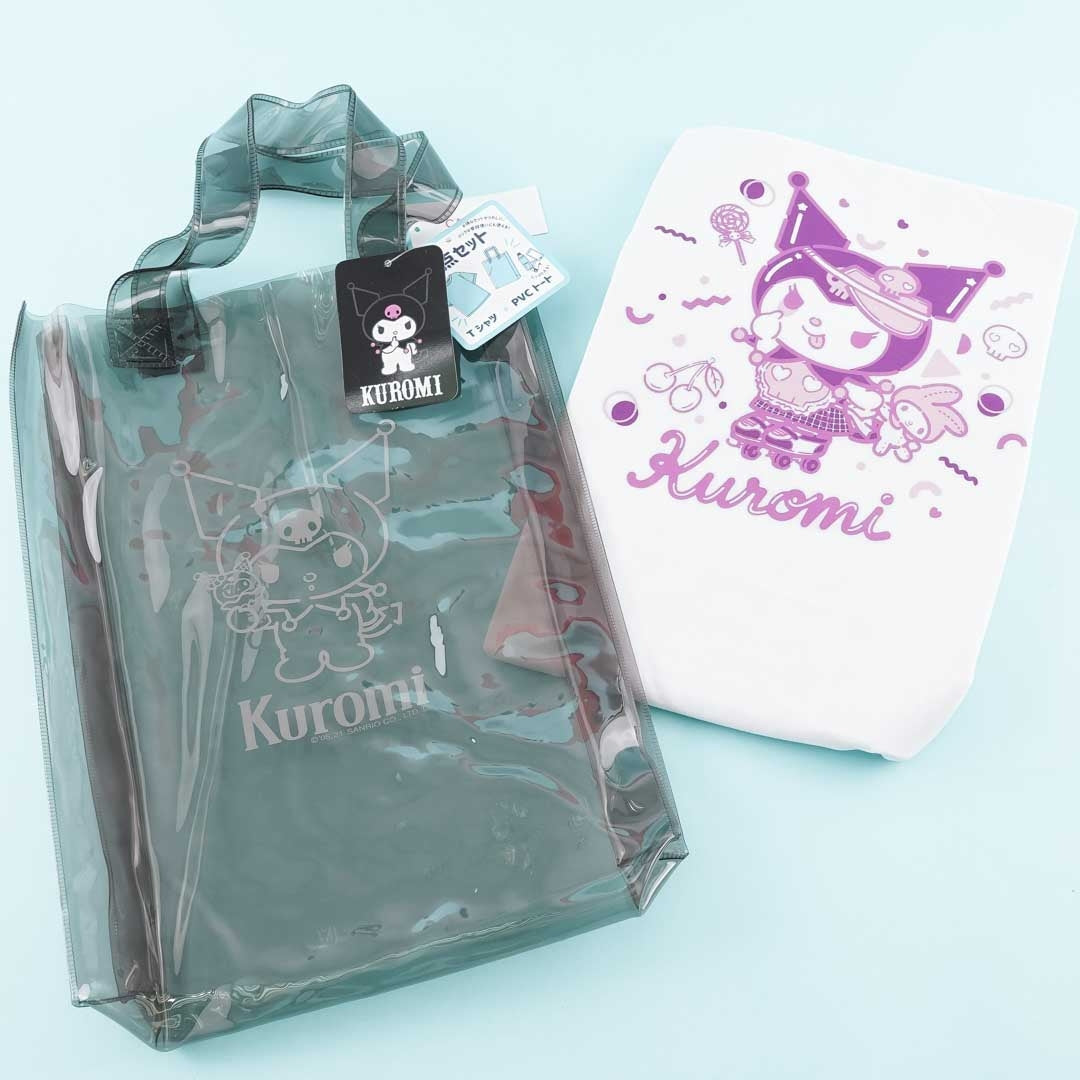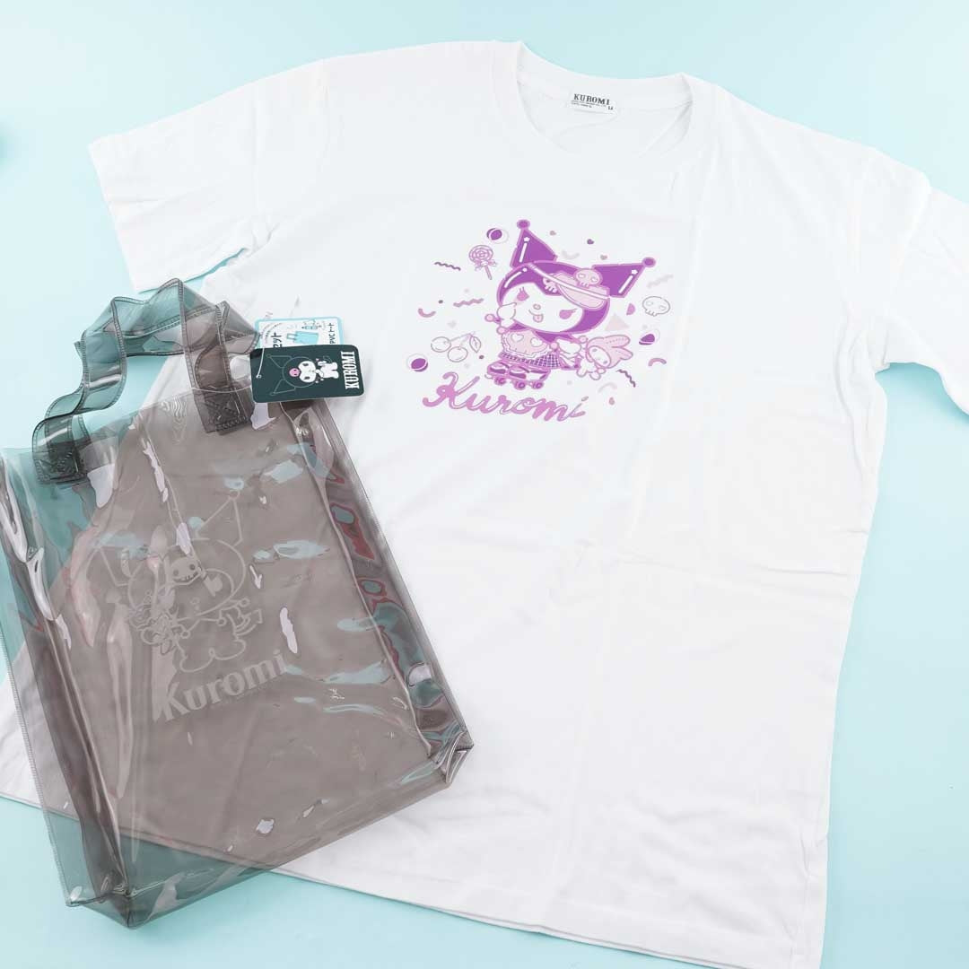 Go out in kawaii fashion with this super cute t-shirt and bag set! It features prints of Kuromi making sassy poses. The white shirt goes perfectly with any type of bottom. Place all your essentials in the gray transparent bag when you go out!