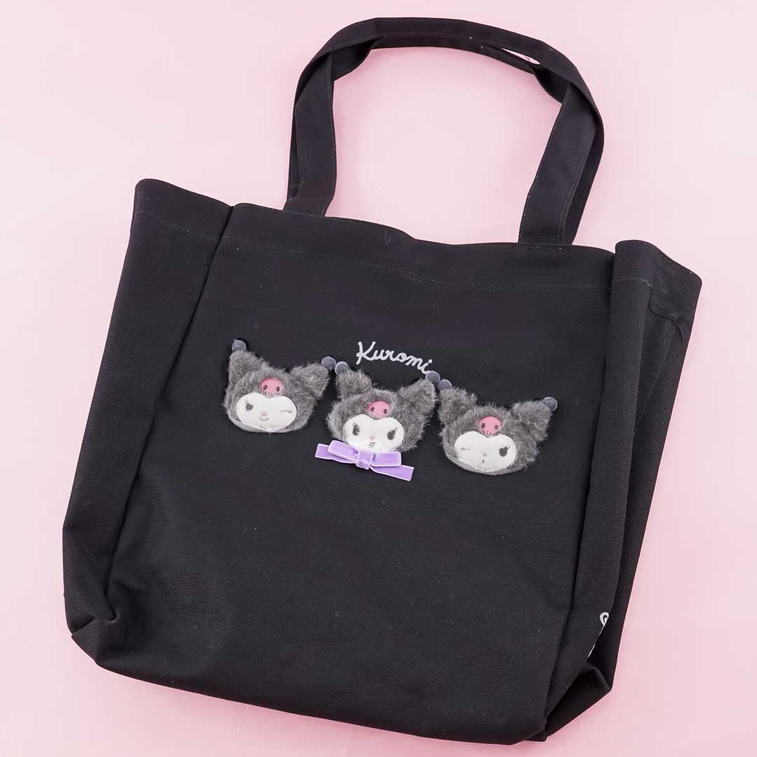 A super cute tote bag that has fluffy Kuromi heads with various facial expressions