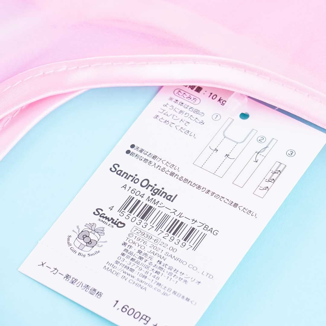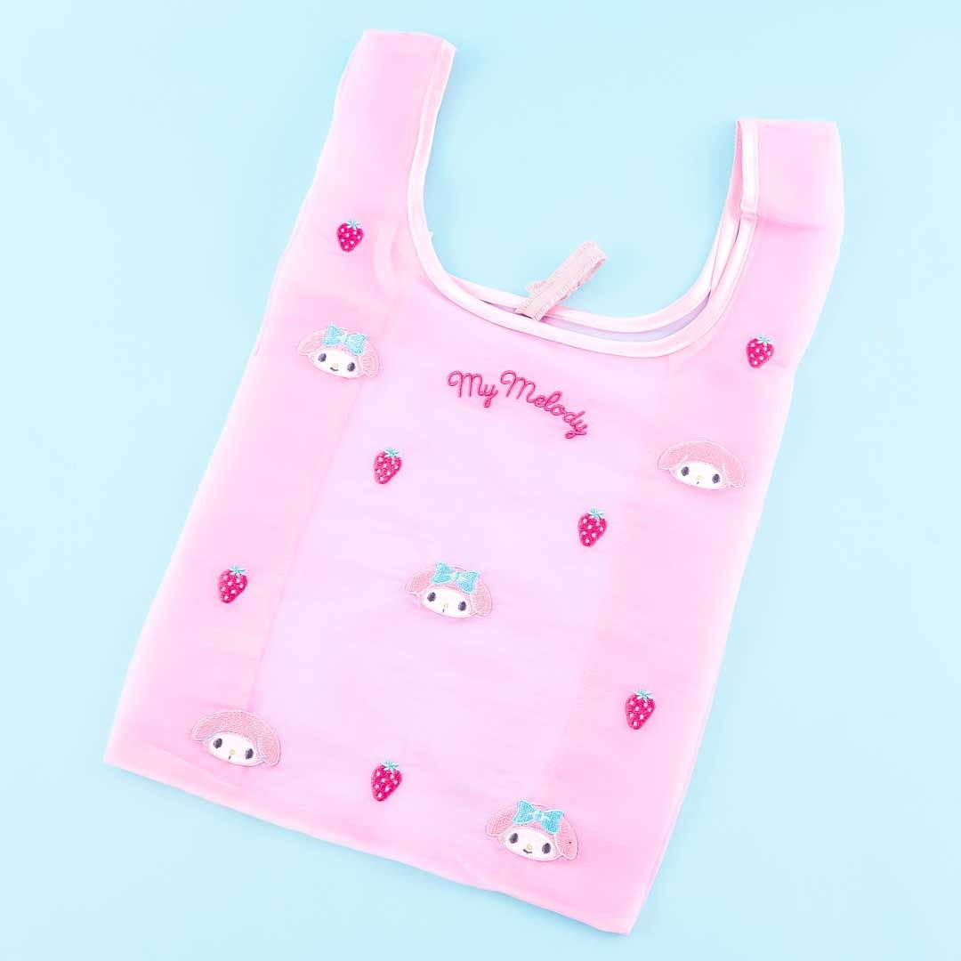 This kawaii translucent eco bag features embroidery of My Melody and strawberries! Use it to carry groceries when you go shopping in the supermarket. It has an elastic band so it's easy to fold the eco bag and store it.