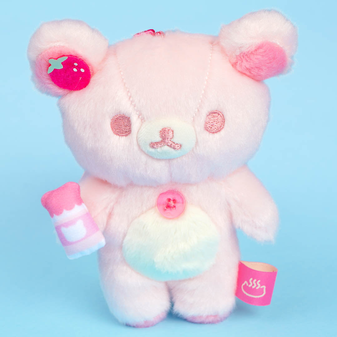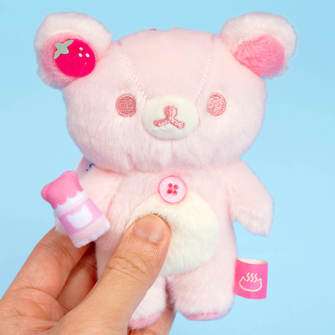 Add a touch of kawaii to your bag using this super cute Korilakkuma plush charm! It features a unique pink color that resembles strawberry milk. This plush charm is part of the Rilakkuma Neko Neko No Yu Series with a cat bathhouse theme!