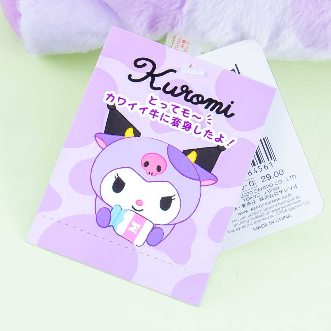 • A kawaii medium-sized Kuromi plushie wearing a cow onesie