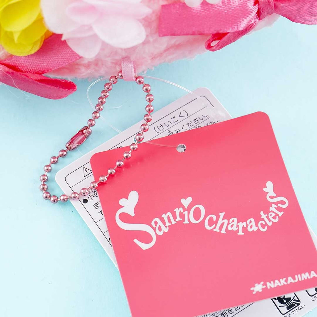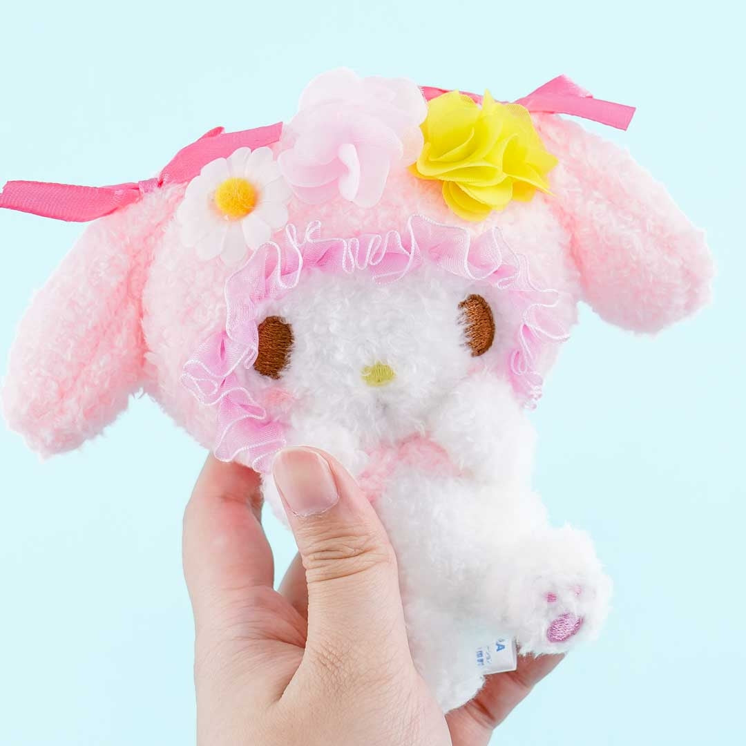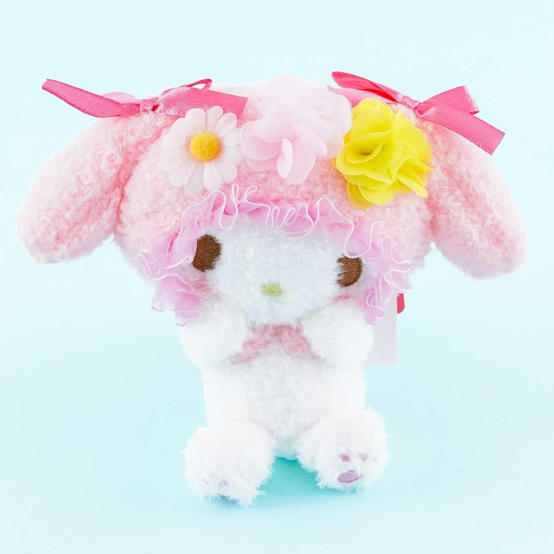 Take along this cute My Melody plushie on your next adventure! This medium-sized cutie with a shy expression on its face is wearing chiffon ribbons and flowers on its head. You can attach it to your favorite bag with its detachable ball chain!