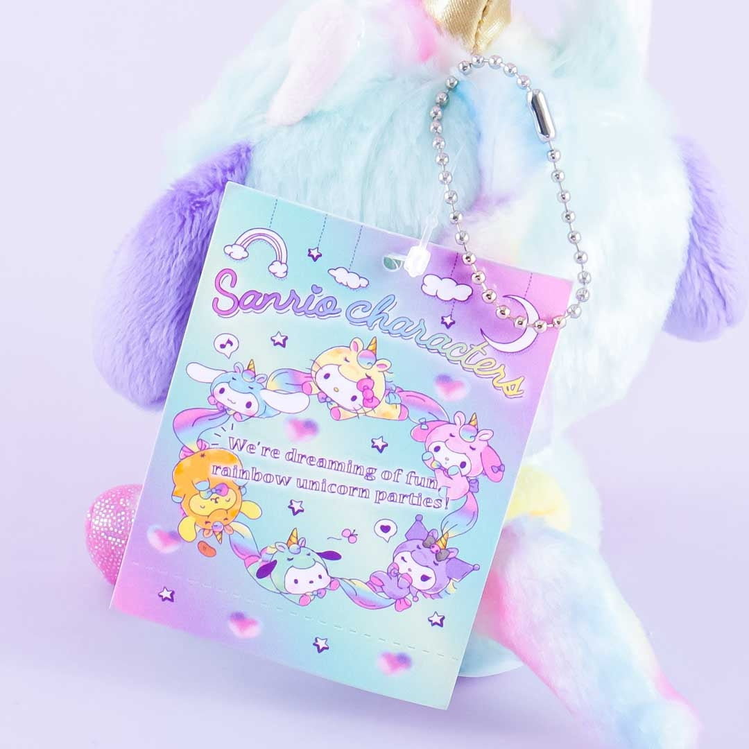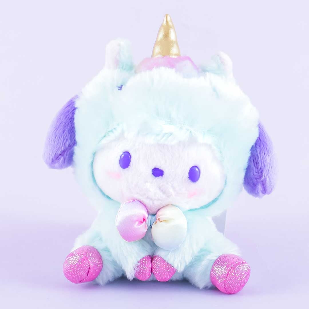 This super kawaii Pochacco plushie charm is wearing a blue unicorn onesie! It's made of super soft material. Attach this mini-sized cutie to your favorite backpack with its detachable ball chain!