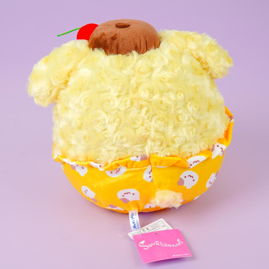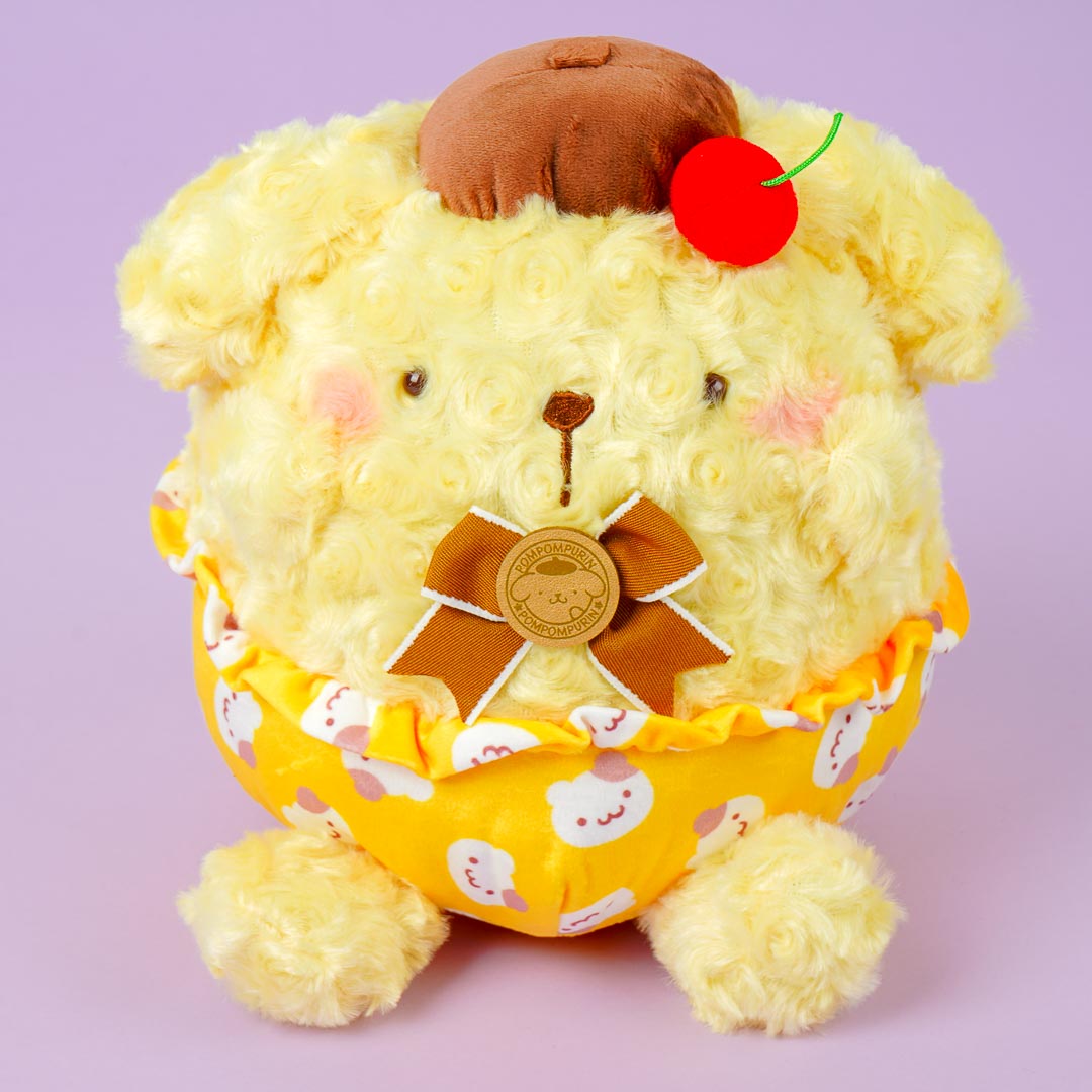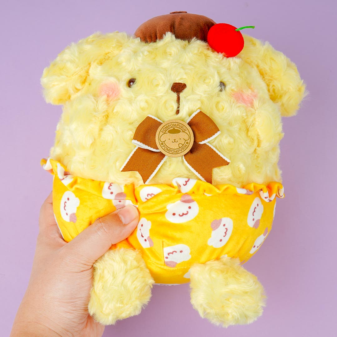 Add this kawaii fluffy plushie to your Sanrio collection! It features Pompompurin wearing Muffin-patterned pants with a cherry on his head.