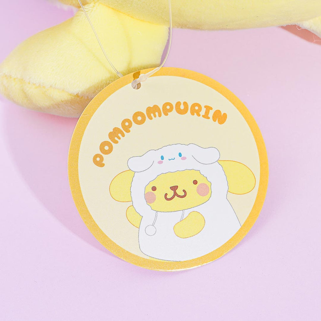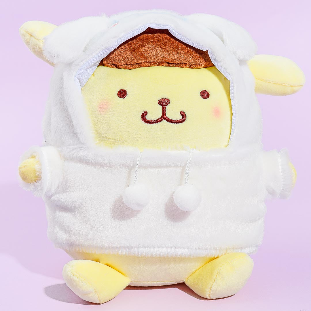 Go on walks together with this super cute Pompompurin plushie. This medium-sized cutie is wearing a hoodie based on his buddy, Cinnamoroll. You can remove the hood off of Pompompurin's head!