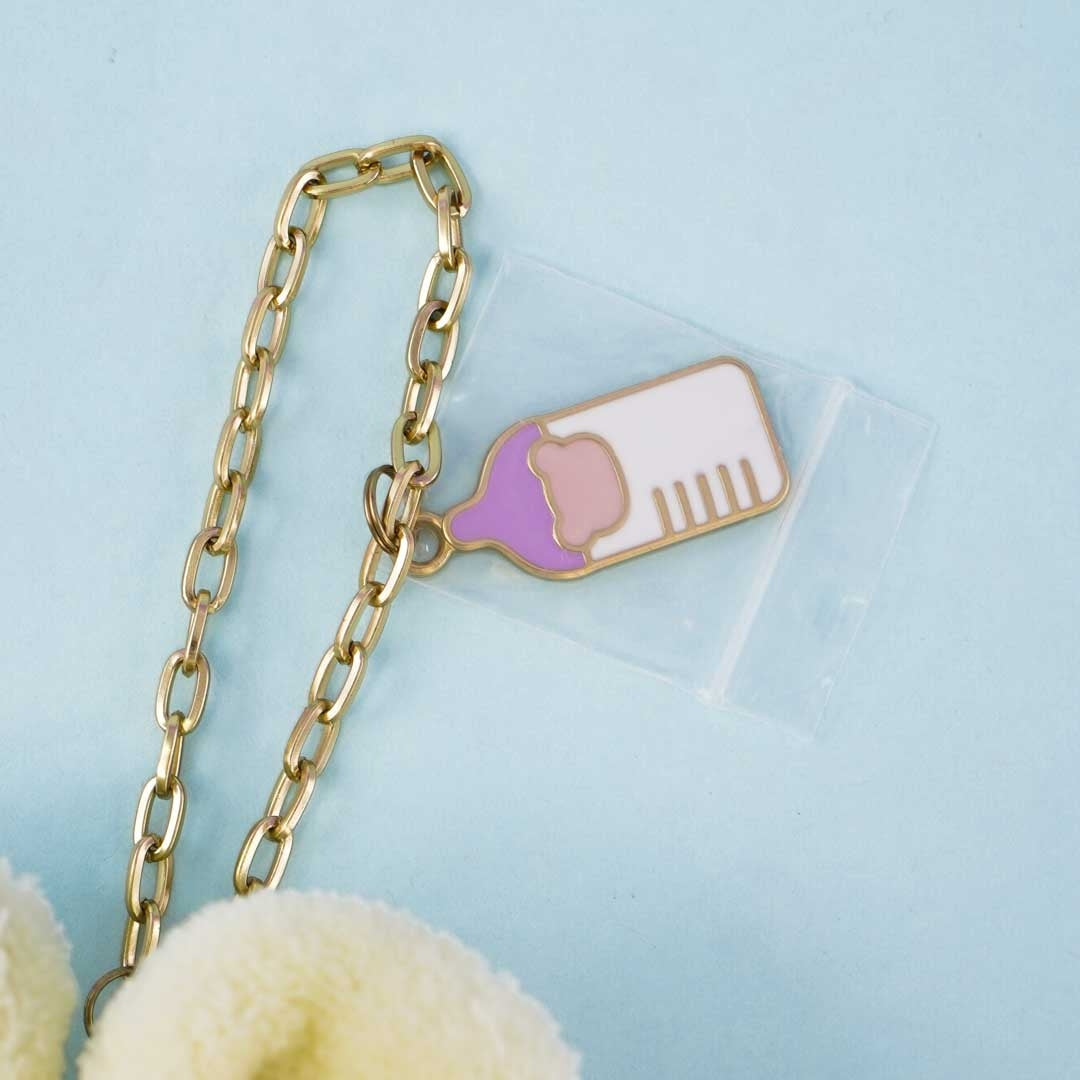 Comes with a detachable golden chain with a tiny baby bottle-shaped metal charm