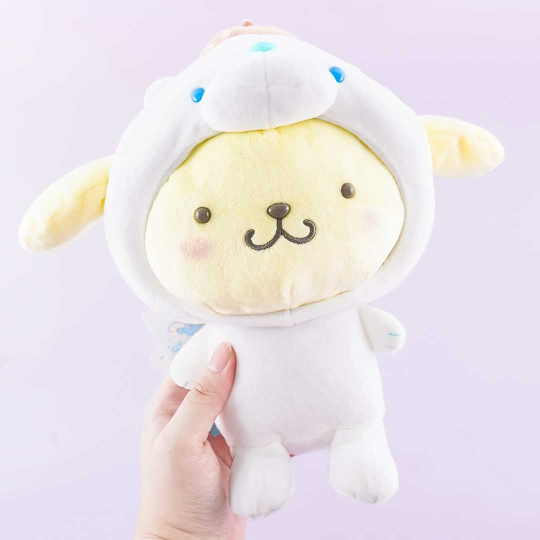 • A cute medium-sized Pompompurin plushie wearing a polar bear costume with a removable hood