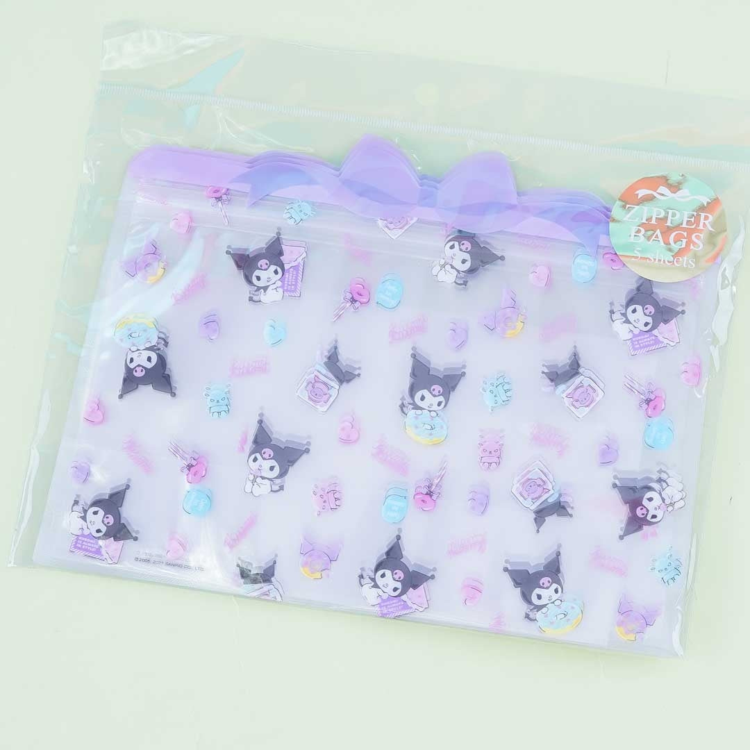 This set of resealable bags is decorated with illustrations of Kuromi and different desserts like chocolate bars, donuts, and lollipops! It also has a kawaii huge ribbon illustration at the top. Store your spare face masks, small cosmetic items, and even snacks in these plastic packs when traveling.