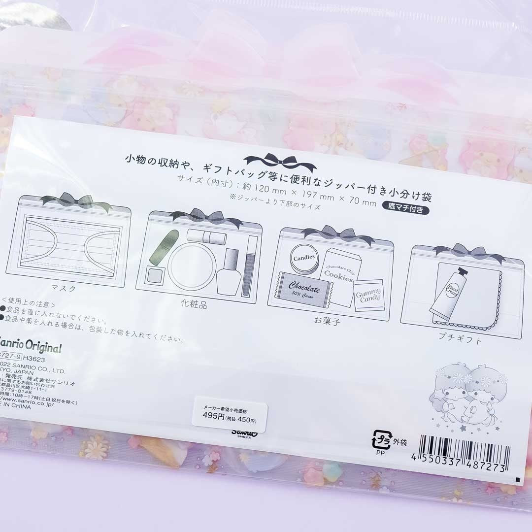 Store your face masks, makeup, snacks, or toiletries inside these transparent zipper bags when traveling. Each resealable bag has kawaii prints of the Little Twin Stars and flowers. It also has a huge bow illustration on top.