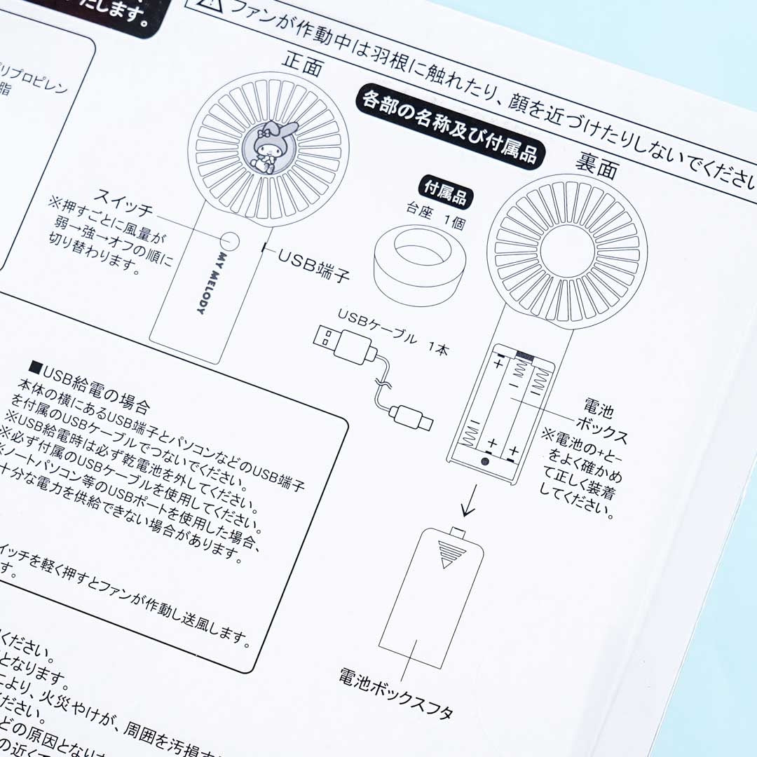 Stay cool especially during warm summer afternoons with this kawaii My Melody portable fan! You can use either AA batteries or USB charging to power it up! Just press the button to switch between weak or strong wind speeds. It also has a base that you can attach to the mini fan so you can prop it up on a desk or any stable flat surface.