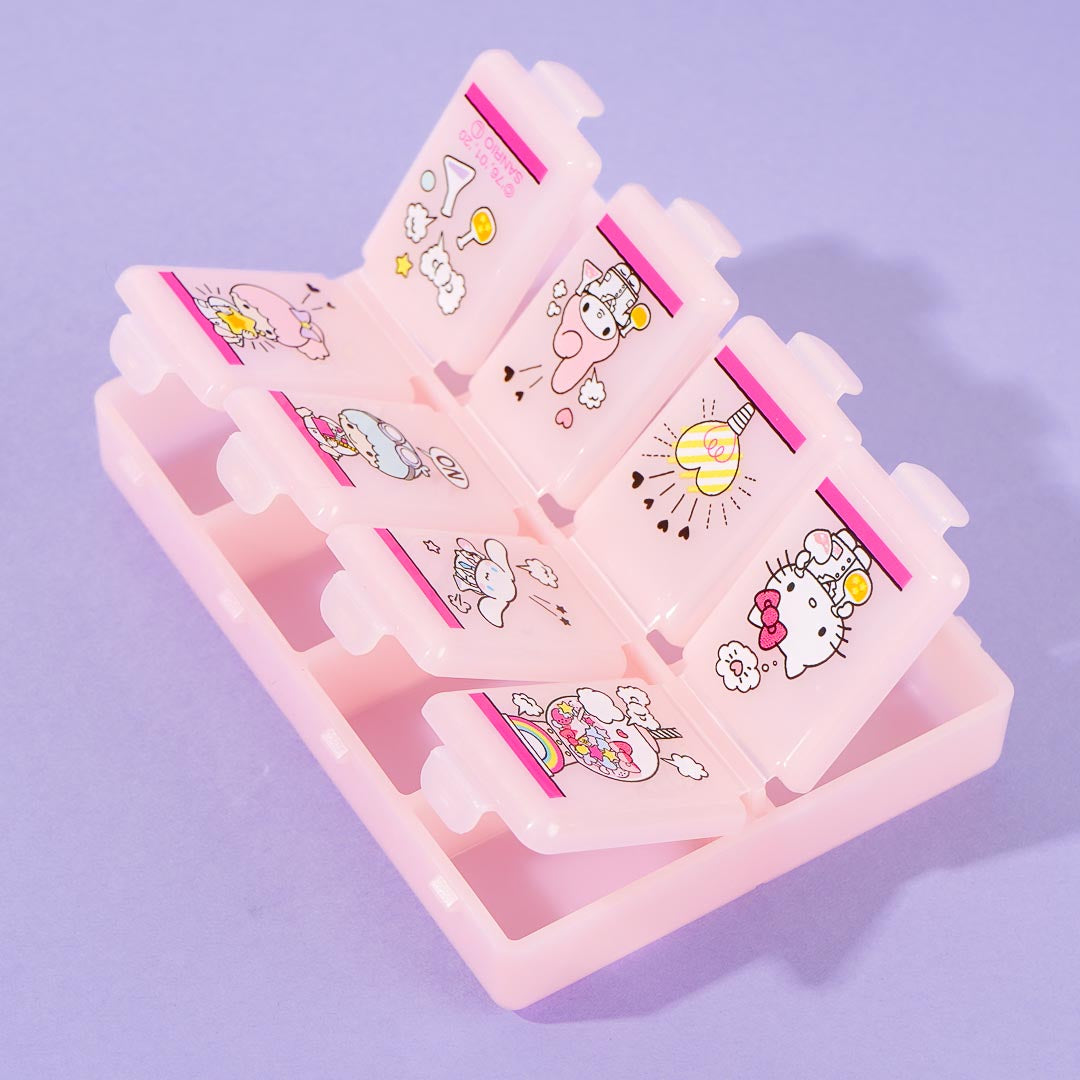 Organize your tablets, capsules, and other pill-type medicine using this kawaii pink case! It has equal-sized partitions and is decorated with cute prints of Sanrio Characters having fun experiments in a laboratory.