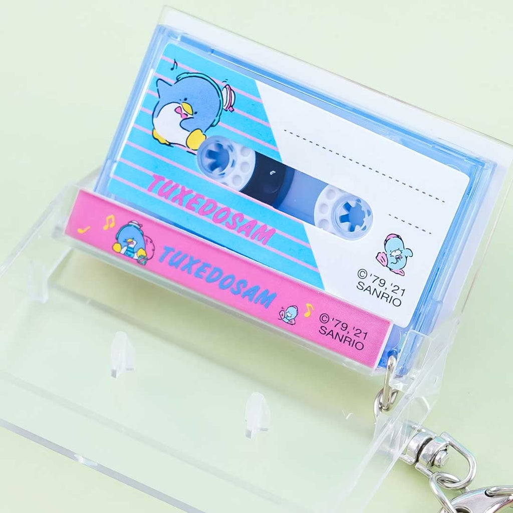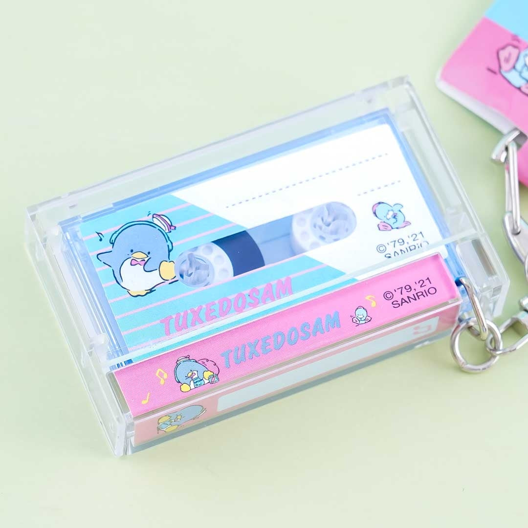 Let your inner pop culture fan gush over this nostalgic charm shaped like a mini cassette album with a metal clip! It features illustrations of Tuxedosam bopping as he listens to his favorite song on his cassette player! This tiny album has a transparent plastic case that you can open to unveil a cassette tape inside.