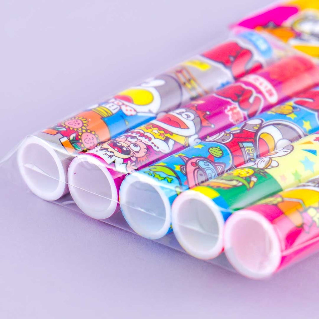 A set of kawaii pencil caps resembling the packaging of different flavors of Umaibo