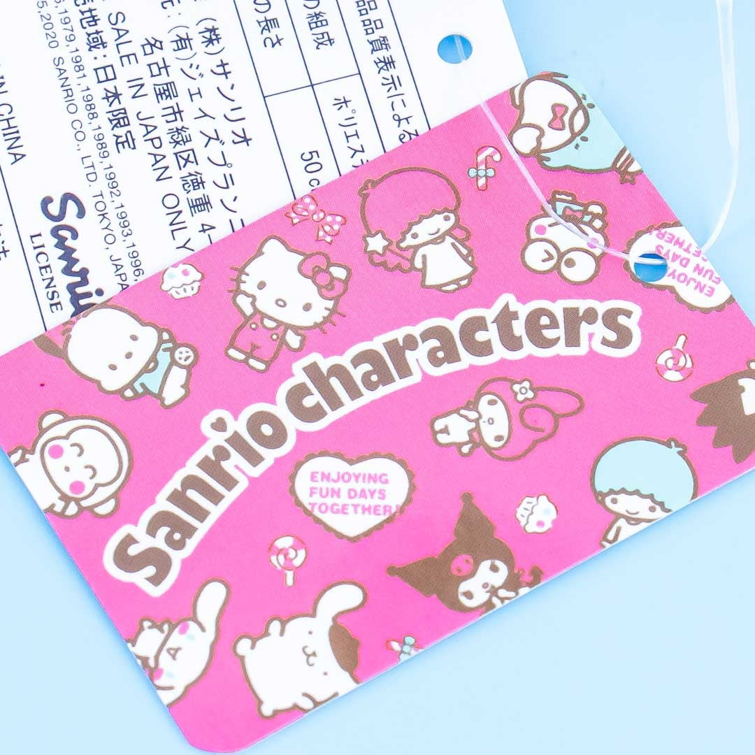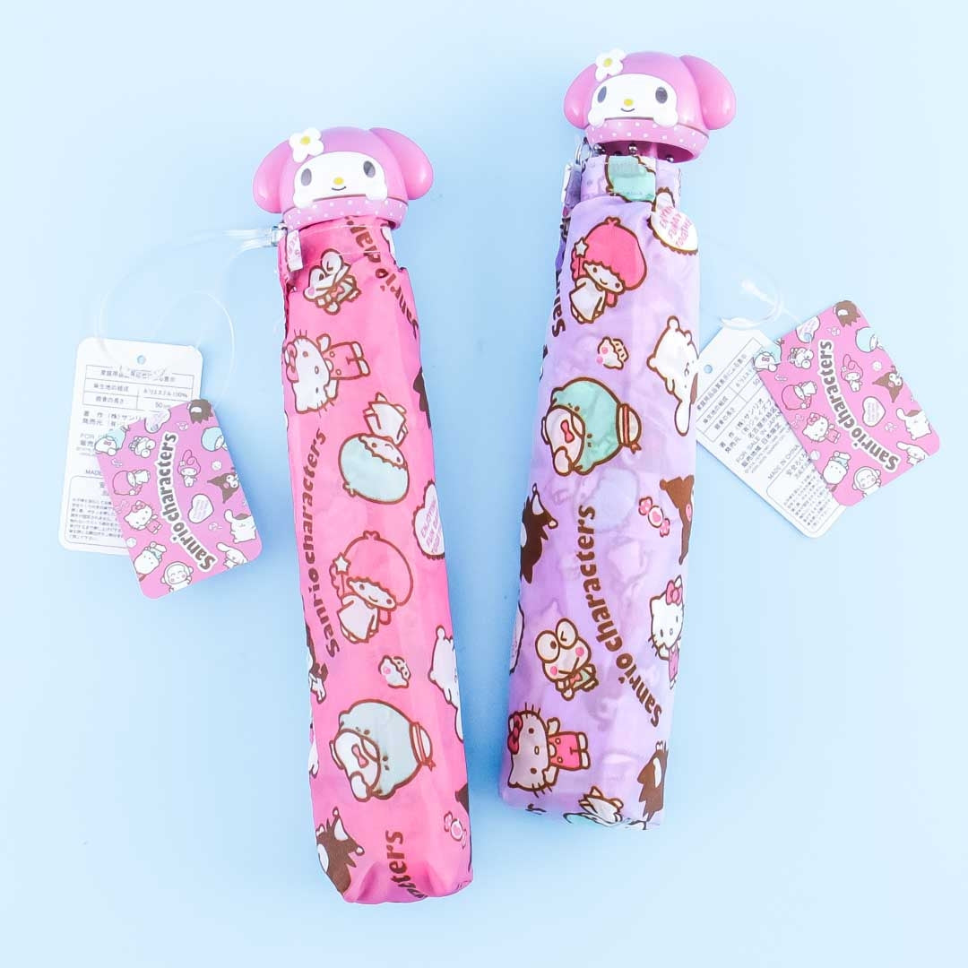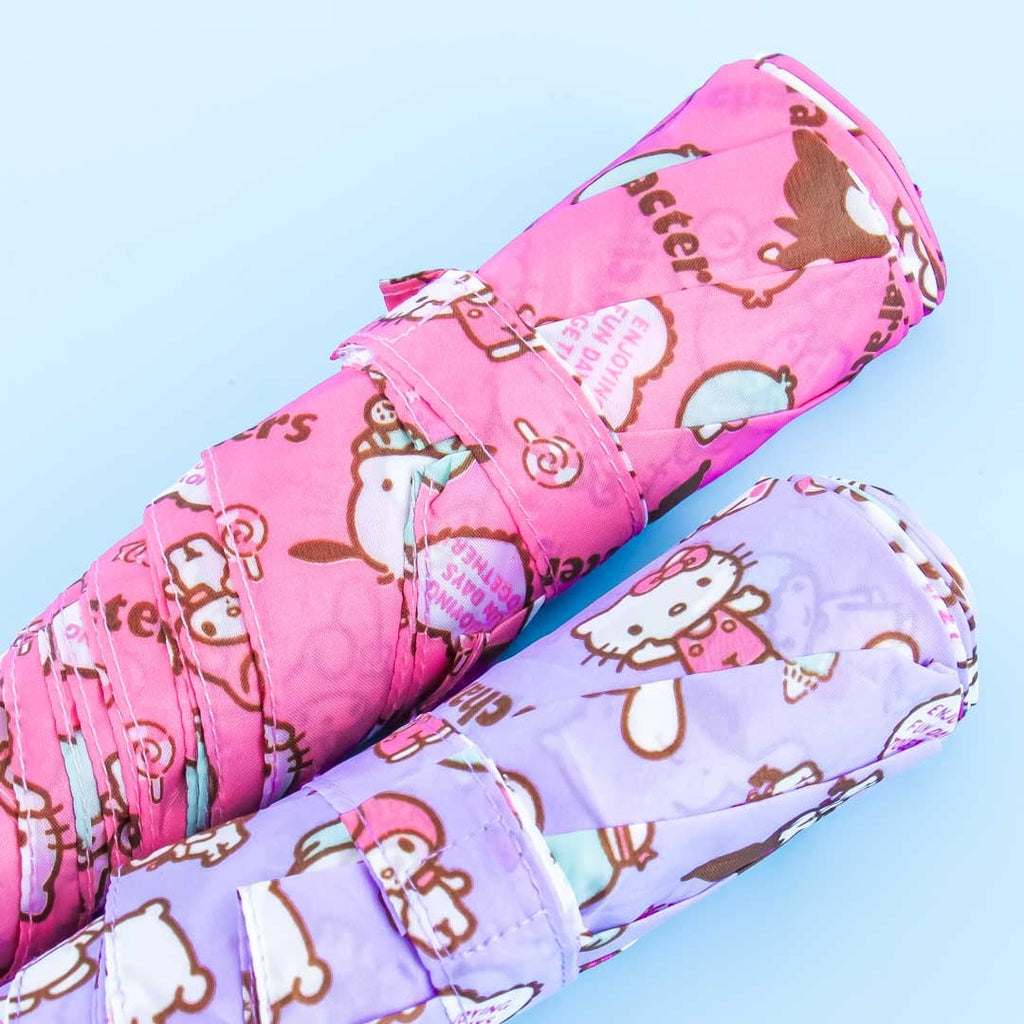 • A kawaii foldable umbrella covered in prints of different Sanrio characters