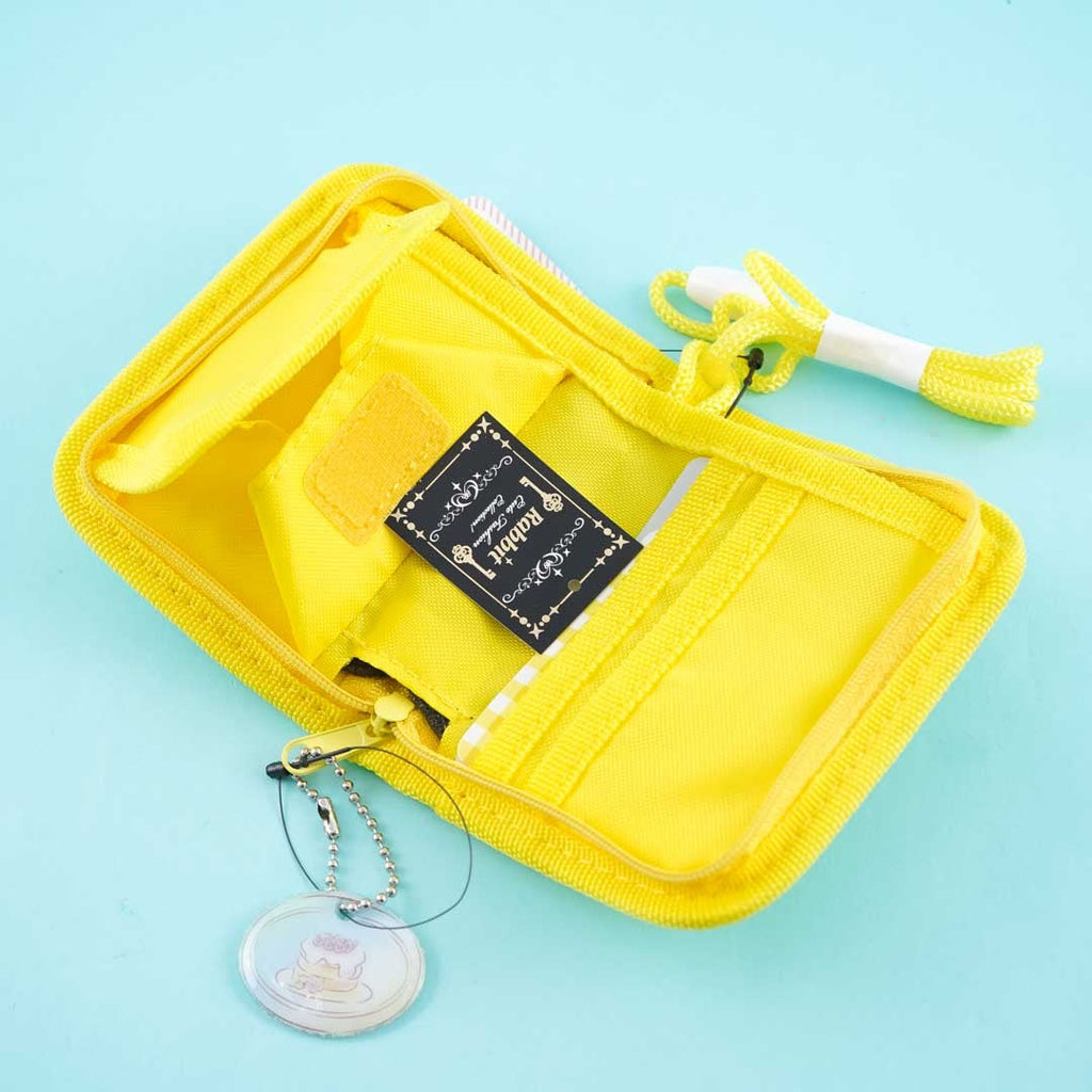 Use this cute wallet to store your cash and coins! It showcases Pompompurin surrounded by yummy cakes. This wallet has multiple pockets, a zipper closure, an adjustable strap, and an oval-shaped charm with a removable ball chain.