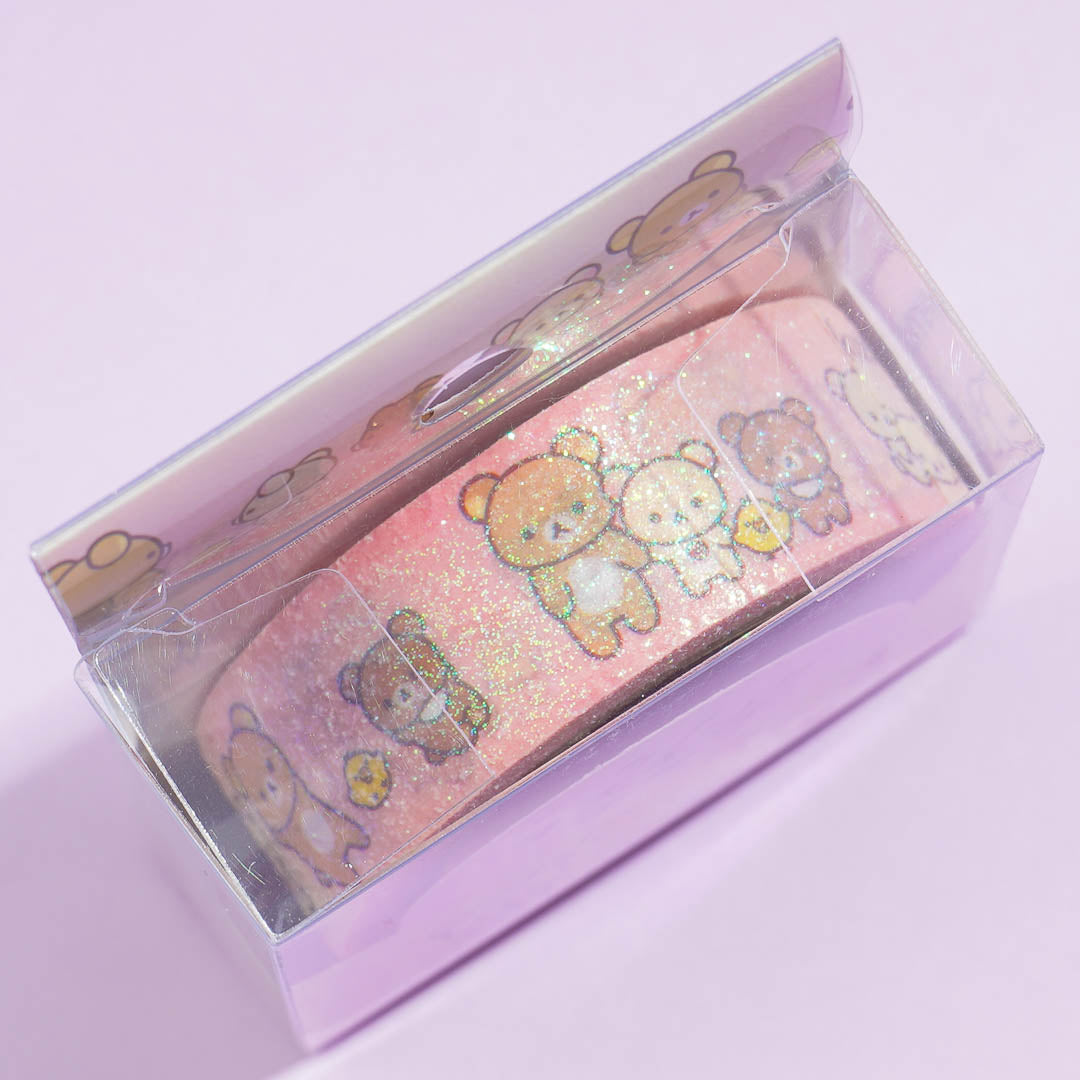 This super cute roll of glittery masking tape is decorated with illustrations of Rilakkuma hanging out with his friends Kiiroitori, Korilakkuma, and Chairoikoguma! Kawaii-fy your plain notebooks using this washi tape.