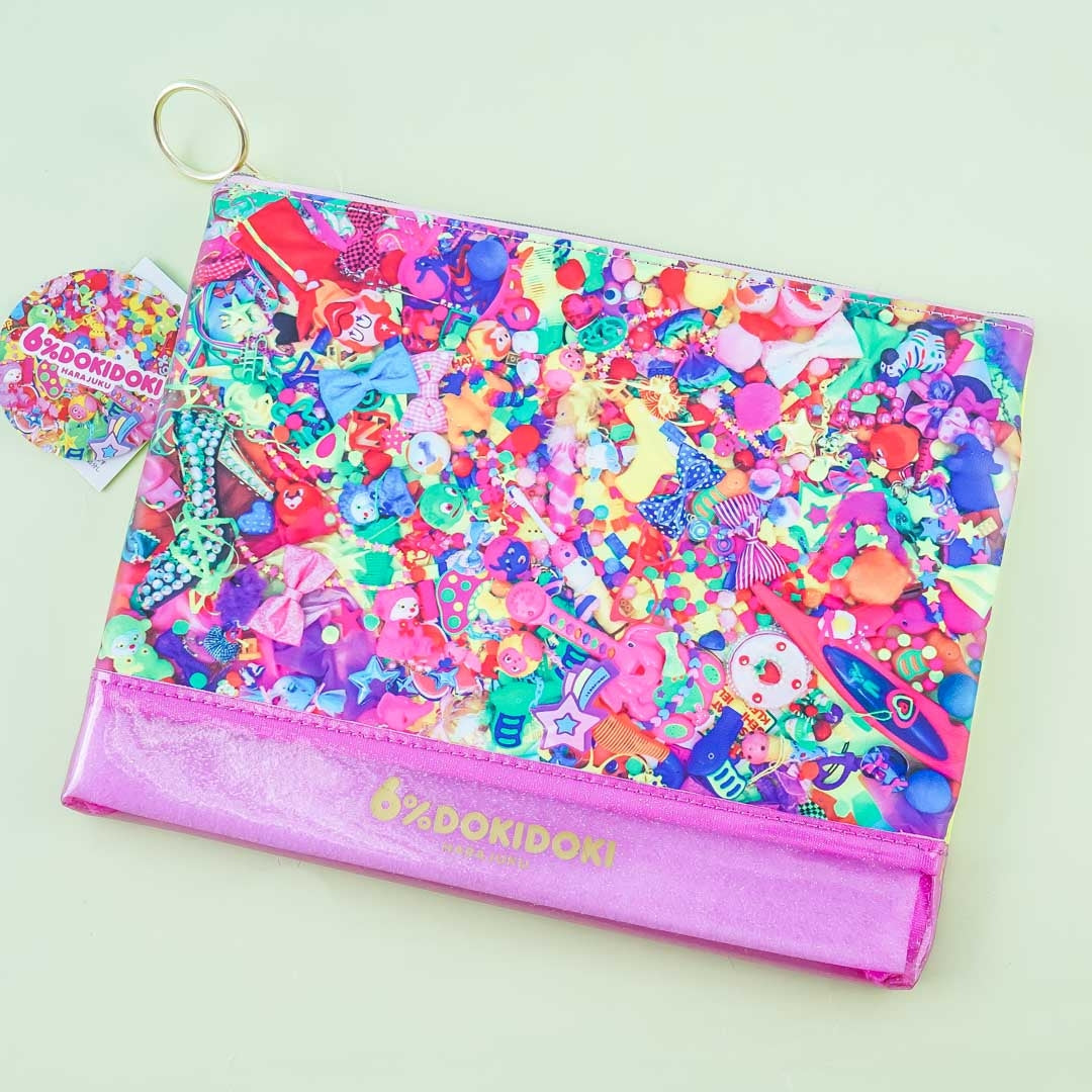 A super cute flat pouch featuring illustrations of colorful kawaii items