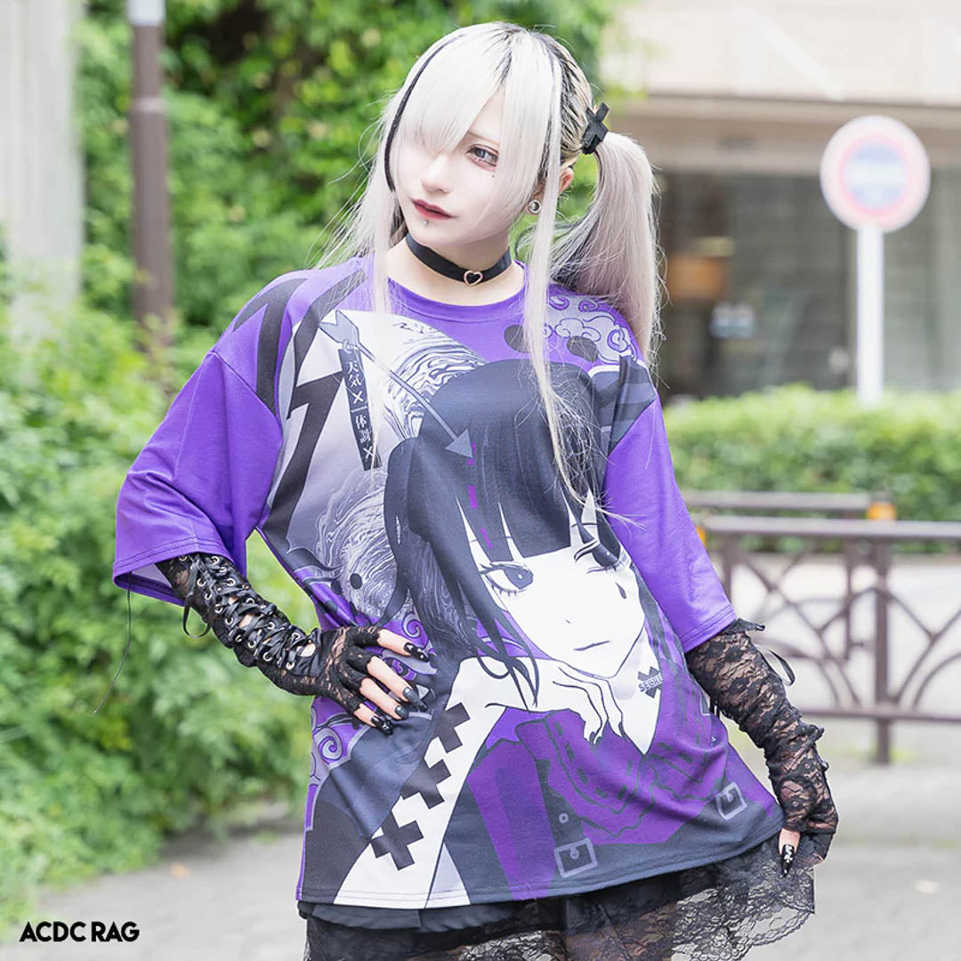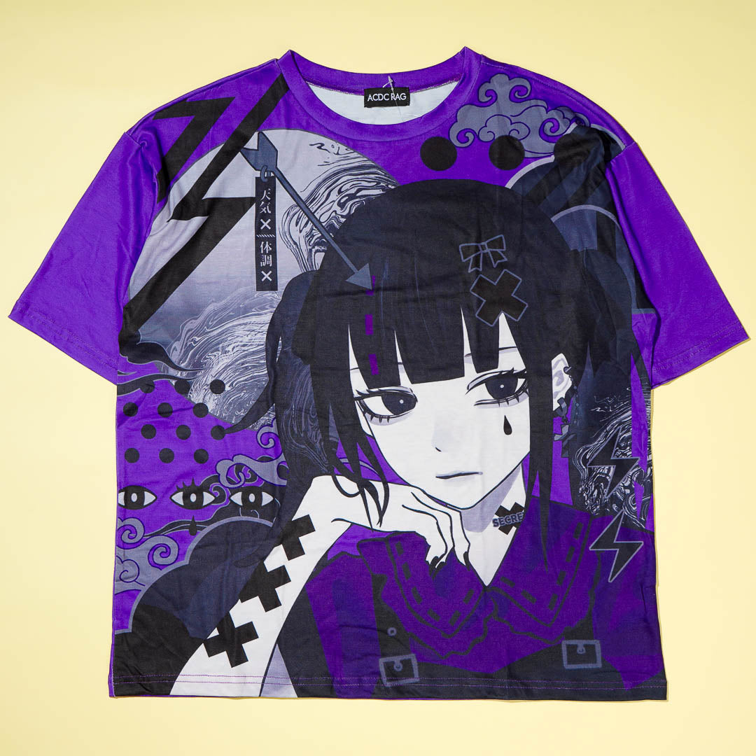 Experiment with your style by wearing this purple shirt! It has illustrations of a Harajuku girl who’s a bit sad due to bad weather! This winning shirt design entry was created by @hlvngkam for the 2023 ACDC RAG Design Contest.