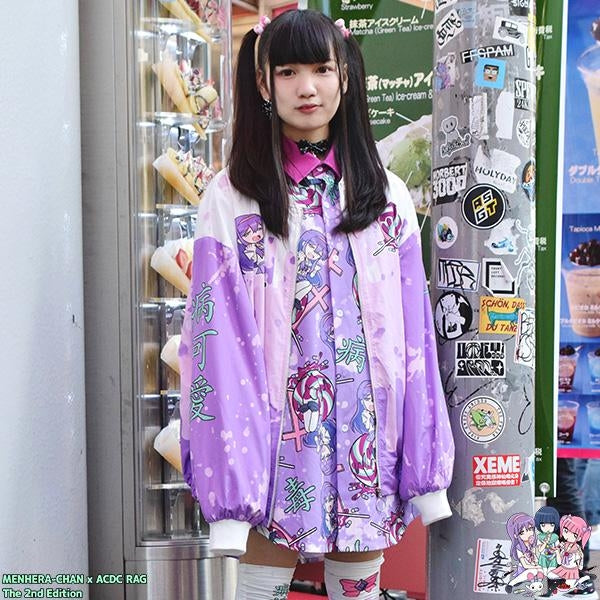 Put on this super cute Harajuku-style bomber jacket to keep you nice and warm during the windy season! It features prints of Yumekawa-chan from the Yamikawaii fashion trend in Japan. This kawaii jacket comes from a Japanese clothing brand driven by a "No Borders" concept.