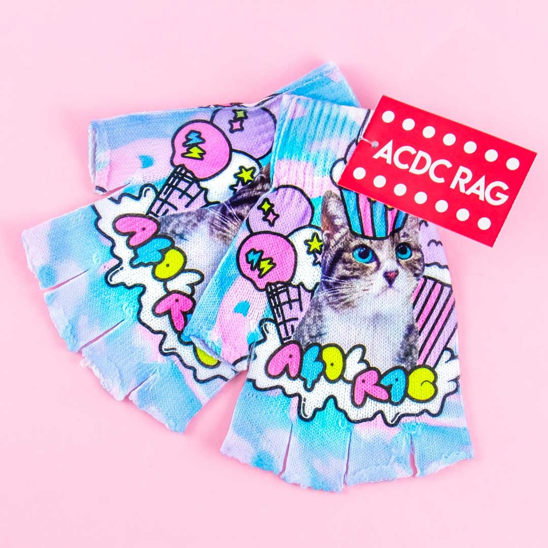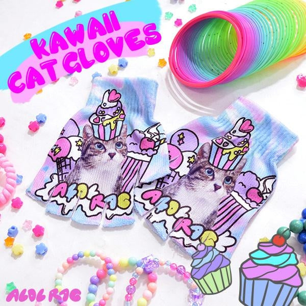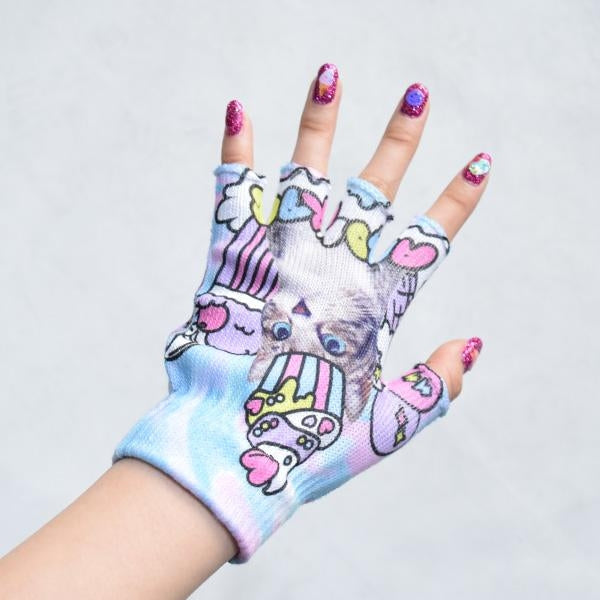• A super cute pair of Harajuku-style fingerless gloves featuring prints of a cat with cake and other sweets